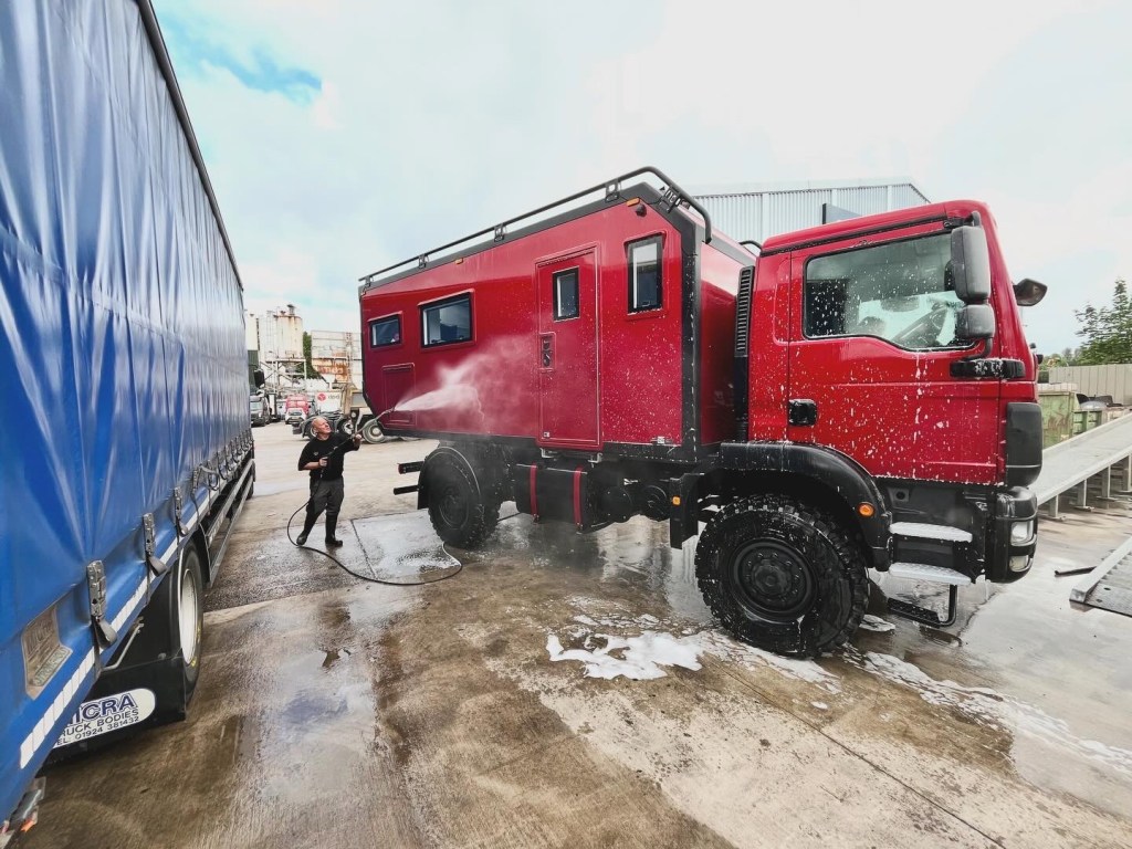 We had seriously underestimated the sheer number of visitors we had; we must have had over a hundred through the truck altogether. We quickly fell into a routine of me dealing with the interior, and Lyn the exterior. I didn’t even recognise myself at times, talking about our 2 x 250 litre water tanks, and how the MAN TGM shares a lot of common parts with the military HX60. Who is this Trucker Girl? Everybody was really complimentary about Dwti, and especially loved the colour. I also revelled in the whole Ta Dah moment when I pulled back the cushion to show the steam washer dryer behind it, like a trucker Debbie McGee.