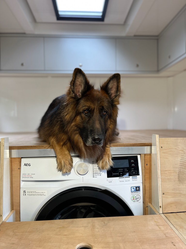 He was absolutely in his element when he came away with us in the motorhome. He could tell when we started to fill it, and a trip was imminent. He got more and more excited, pacing around and getting in our way, before making a bid for freedom and racing into the cab. He sat between us in the cab, like a proud child. I could almost hear us asking “are we there yet?” His happy place was definitely in Pembrey Country Park, where we often used to overnight on weekends. He used to chill outside the van, just watching the world go by, happy to wait until his next walk in the forest, run on the beach, or dip in the sea. The motorhome wasn’t big inside, and he took up most of the room! If he was in the kitchen area there was no room for anyone else; we all had to do the “kitchen shuffle” to get past each other.