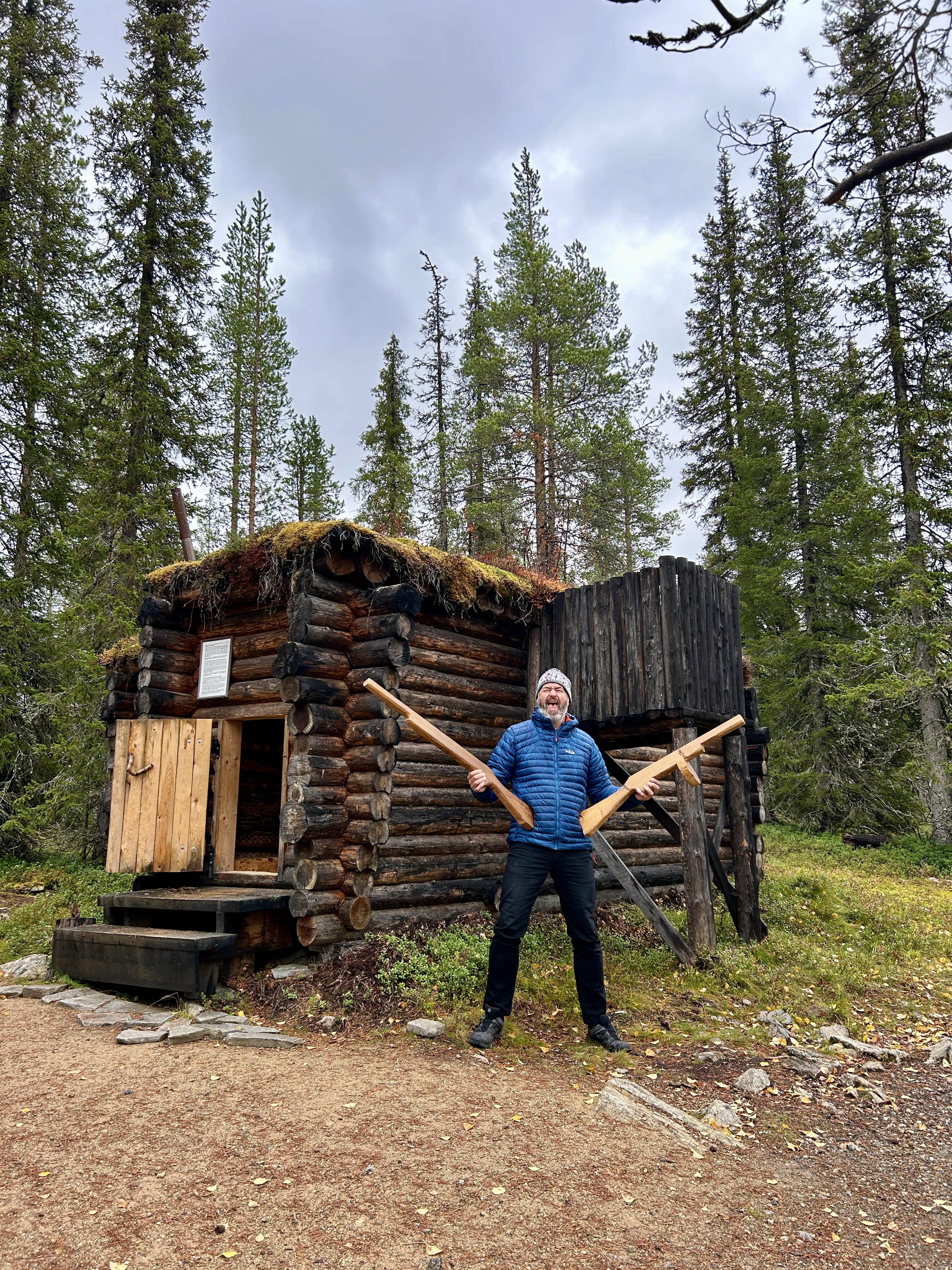 It is interesting to see the difference between Finnish and British culture. As we walked into the park we could see a set of walking poles stood up against a wall. Obviously, somebody had forgotten them, but they had not been taken, and were still there when we passed on our way out two hours later. The little wooden shelter used by the Germans had wooden guns in there left for children (and Lyn!) to enjoy. I get the feeling these would have been stolen or ruined in Britain. We also came across a little hut called Hopiaoja; named after the creek that runs nearby. This is for people to gather and make a fire in the centre, and sit around. There is even a wood shed nearby, stacked with neatly cut wood and axes, which has not been abused in any way. Lessons to be learned I think! In 1934 gold was discovered from the creek after a dream revealed the source to a local man. Since then gold has been prospected and there is now a panning site for tourists.