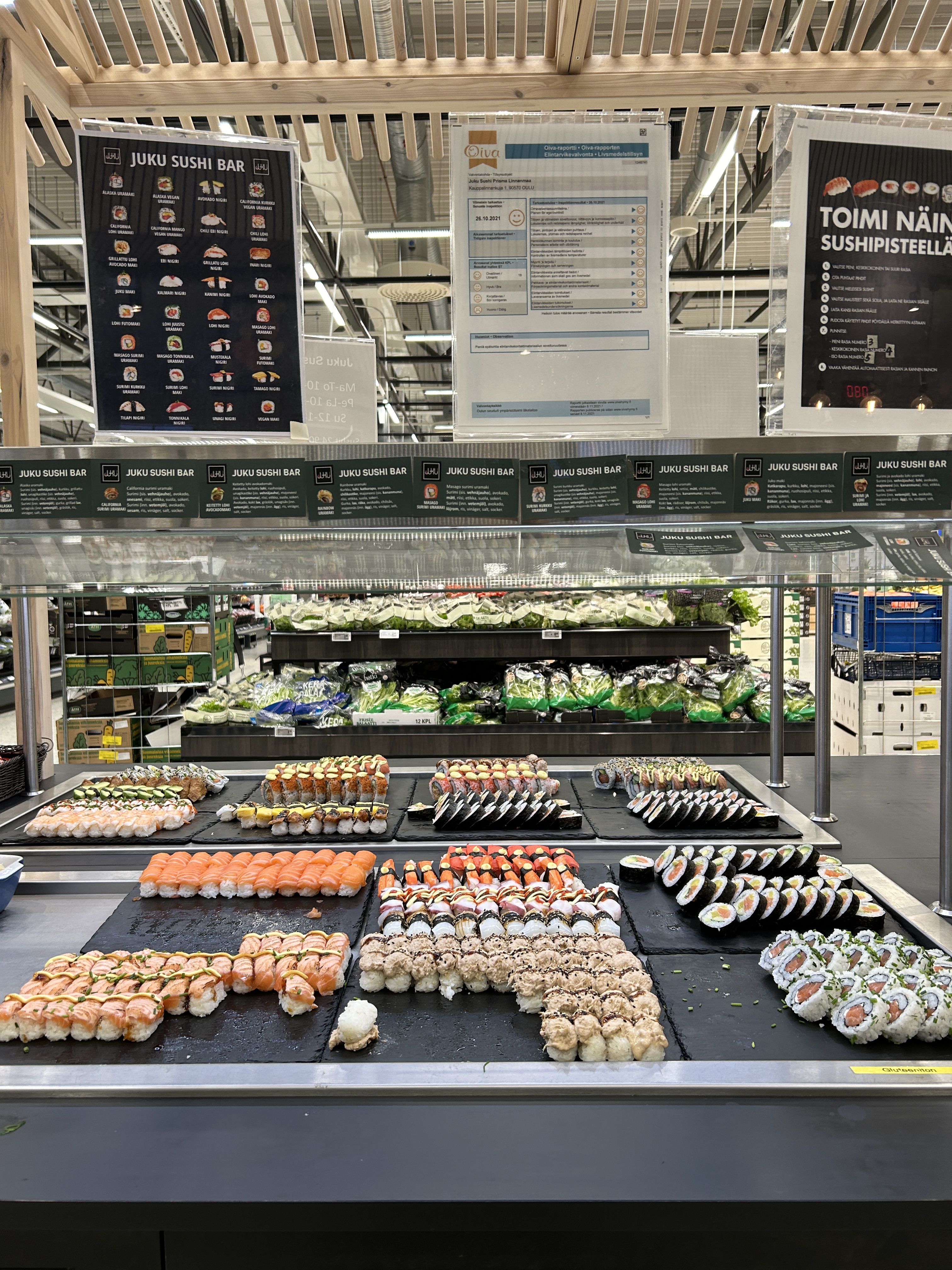My spooky intuition proved correct, and we were blown away by this gigantic behemoth of a food store. In fact it would be disrespectful to refer to it as a food store. You want an ice hockey stick? Look no further! You want a giant ladle for your home sauna? Over there if you please! You want Gore-Tex Merrell boots? Just this way Sir! We wandered round like kids in a candy shop, literally. They also had a fantastic Sushi bar; just a shame I hate Sushi as it all looked so pretty!