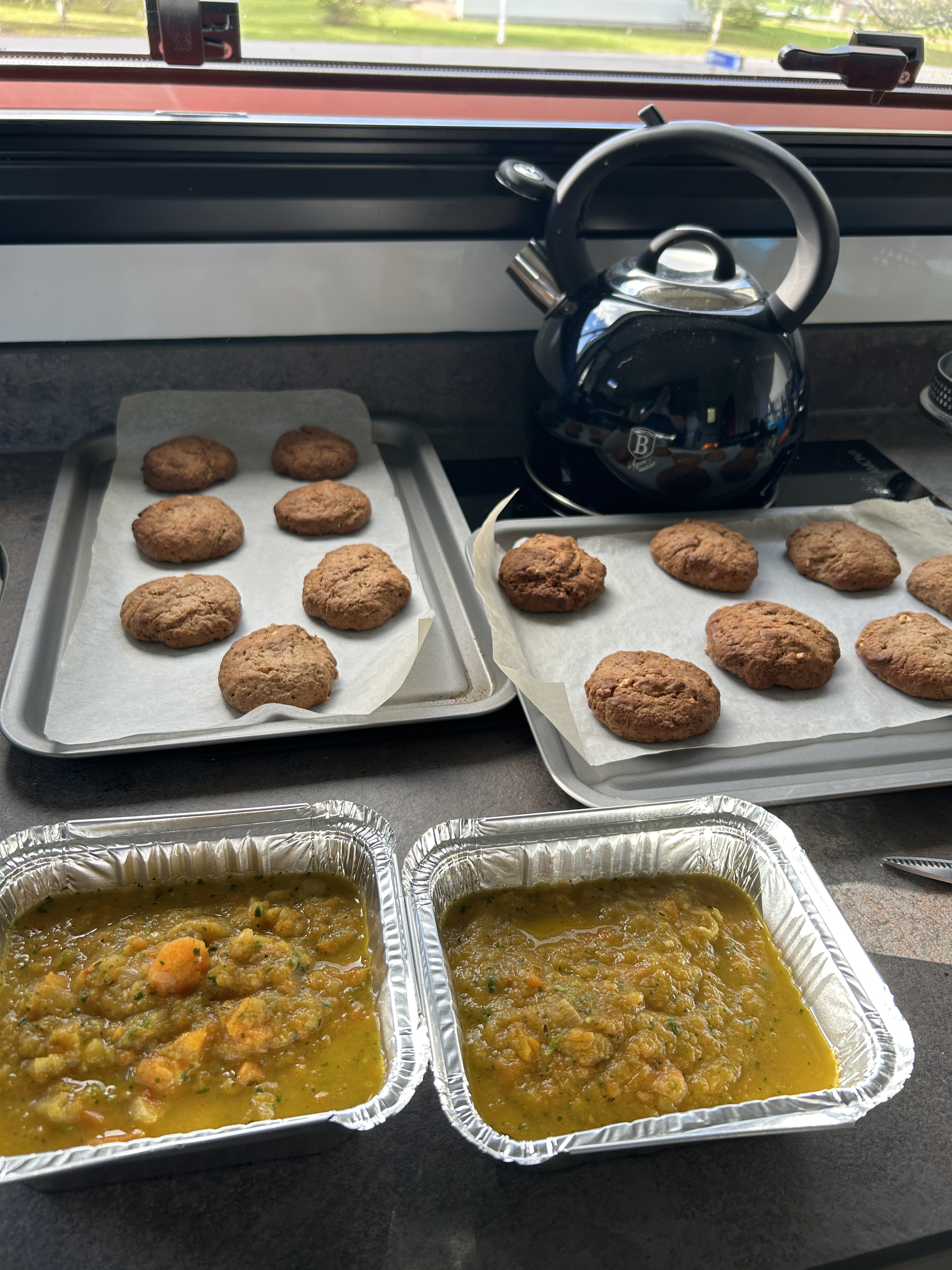 We parked up in our campsite, after paying 44E for the night. It is not cheap but does include electricity and is in a great location, almost on the seafront. We filled up with water and parked up to make the most of the electricity. I cooked my little heart out, making a harissa chicken feta pasta bake again for dinner, plus making carrot and coriander soup, cheese and potato pie, and peanut butter cookies, which are all in the freezer. The we started on the washing! How do we accumulate so much, and that is before I stripped the bed, which I declared to be a tomorrow problem!