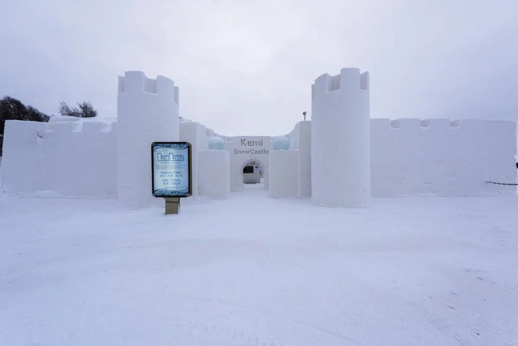 Our first night’s stop was at a place called Kemi, where we encountered both the good and the bad that Kemi had to offer. The good was our visit to Intersport; a sports shop in a shopping mall. We had hoped to see some good quality Finnish winter weather gear, and it certainly didn’t disappoint. I ended up with a pair of winter ankle boots and Lyn with a pair of trousers. Not cheap, but we can get the tax back as non EU residents. It looks like it will be a bit of a faff, but at 24% off it will be worth the effort. The clothes in the shop are mostly marked up with “-30 degrees” labels, so I am sure that means they can cope with a winter in Wales! After the sheer pleasure of looking around this amazing Aladdin’s cave of mostly unaffordable gear, we headed onto Kemi’s biggest attraction; the “Snow Castle”. This is billed as the biggest snow fort in the world, which is rebuilt every winter. In fairness, the pictures do look amazing; it’s just we are several months too early, and what we got to see was a white building! Not quite the same! The two photos below show what we did see, and what we would have seen in a month or two! Timing is everything!