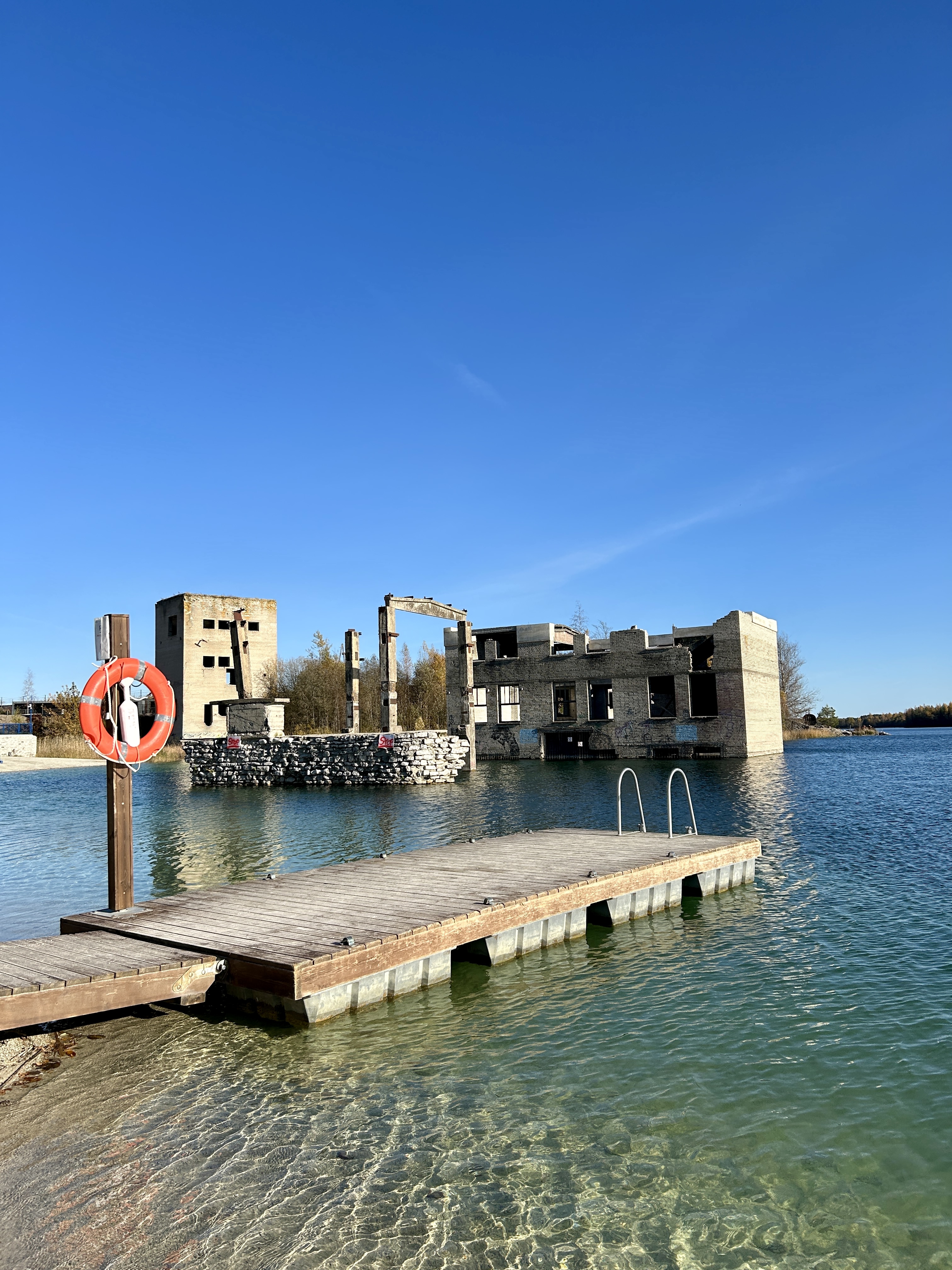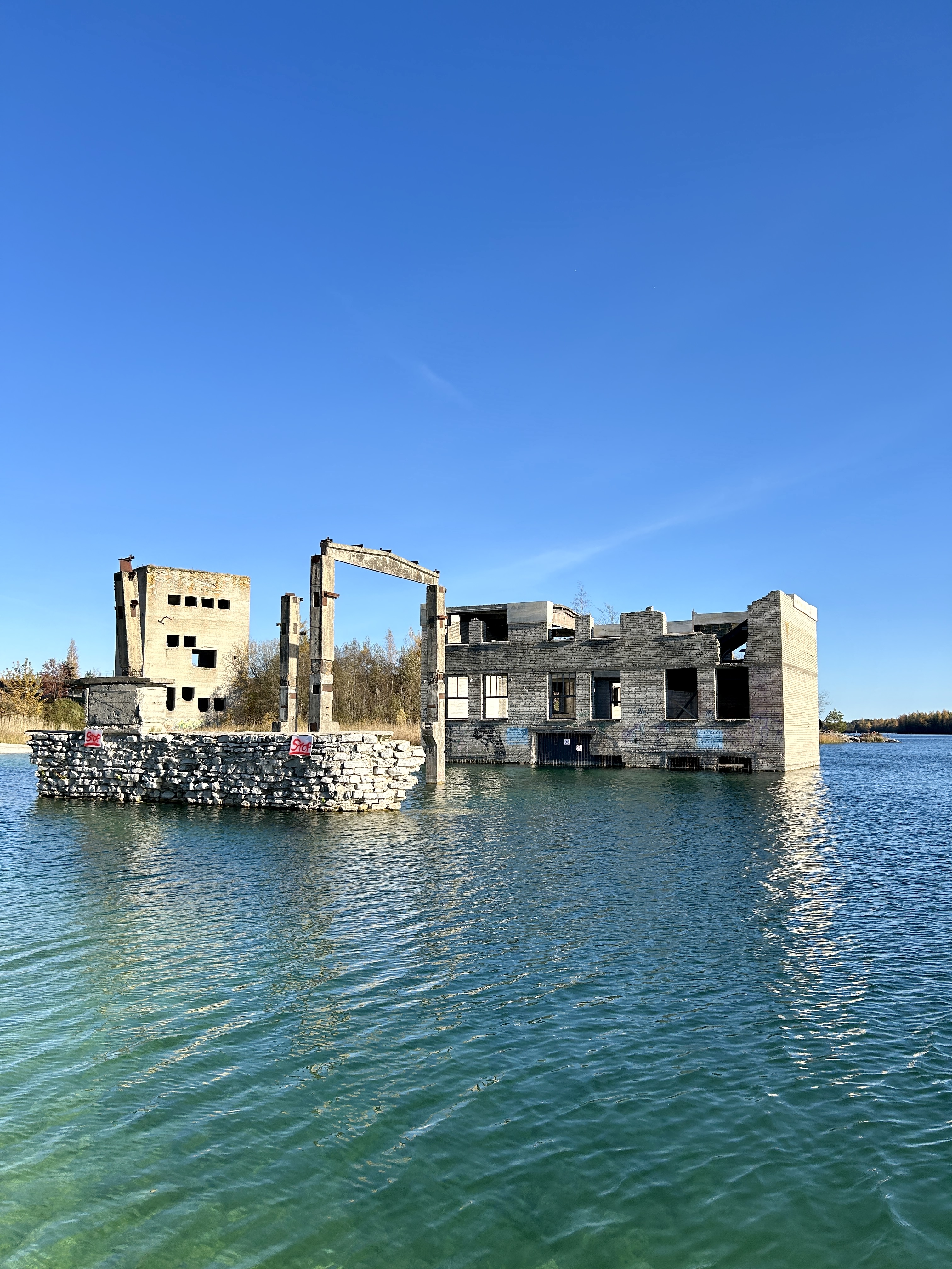 The quarry filled with water in the 1990s and there are various stories as to why. Some think an excavator dug a water channel, or that there was a power outage and the pumps stopped, there are even thoughts that the electricity bill was unpaid and the electricity turned off. Other suggestions involve the pumps breaking down. The quarry filled with water practically over one weekend and there was nothing left to save. The mine’s buildings, heavy machinery and trees were submerged. When the prison closed in 2013 it became an exciting destination to visit to swim and dive.