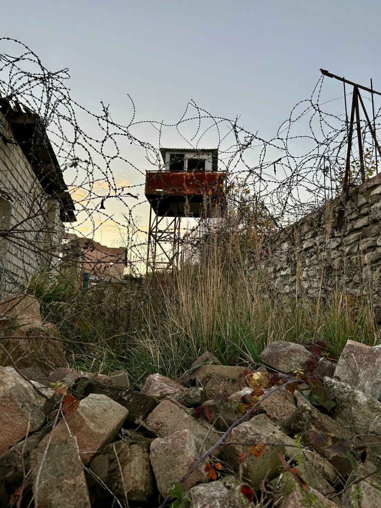 We couldn’t wait to swim in it, so paid the 30E to stay at the deserted campsite here. They are obviously investing in here, and it is definitely a much busier place in the summer with an inflatable water park in the lake. The water in the quarry was so cold and clear, and about 9 degrees. Luckily it was a lovely sunny day, with beautiful blue skies and about 11 degrees. We had it totally to ourselves. It was so strange swimming looking at ruined buildings sticking out of the water, with a Devils Tower type mountain behind us, and a barbed wire derelict Soviet prison alongside us. I bet these walls have some stories.