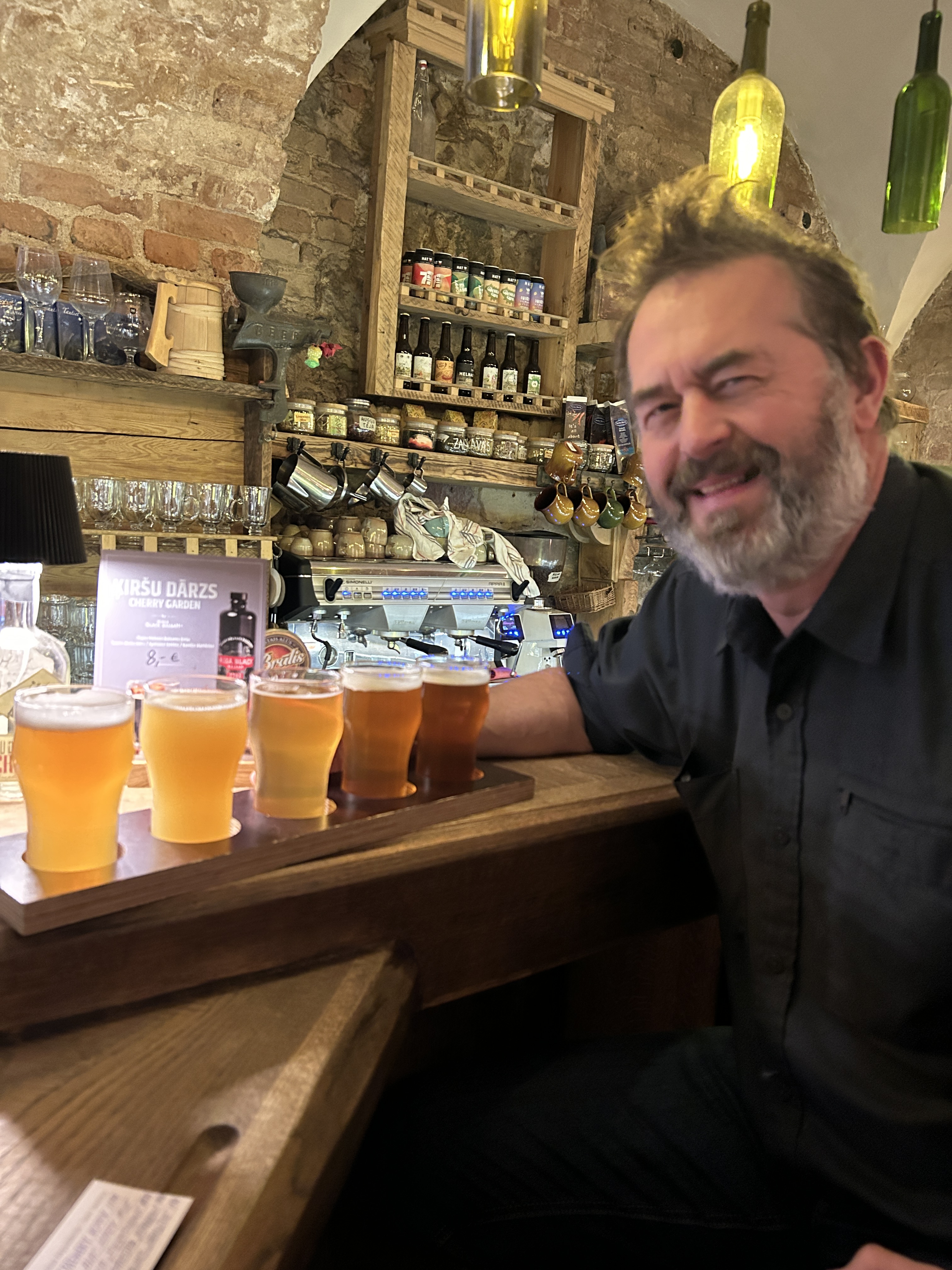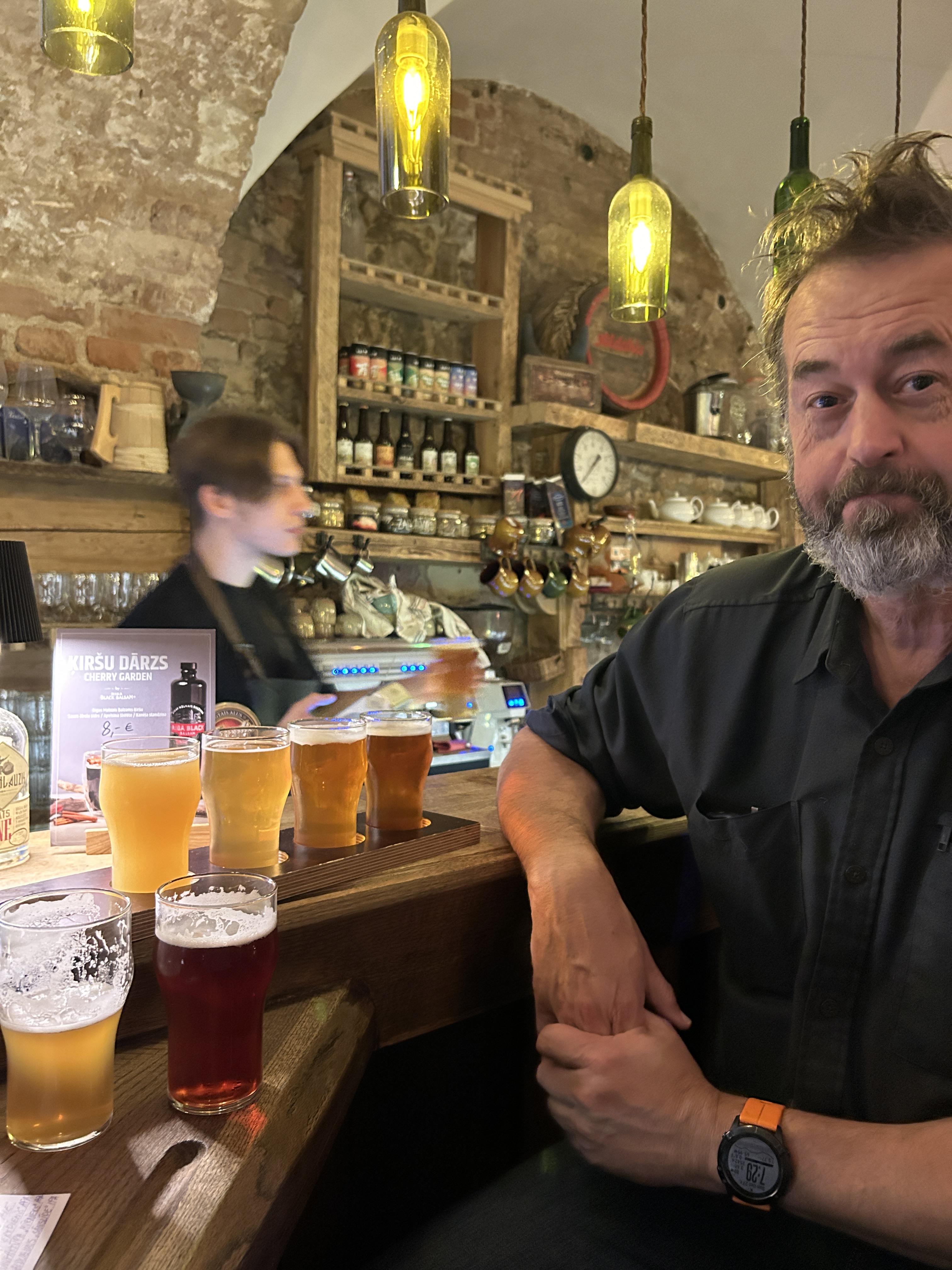 Our first mistake was stopping in a Belgian Beer Cafe! Some 8% Belgian Kreik, (cherry beer) went down very nicely for me, whilst Lyn tried something different! From there we went on to a place called Andante, which was a lovely cocktail bar with a friendly bar tender and a stack of LPs and a turntable. They must have known we were coming as “Songs of the 80”s was on. 2 cocktails and a request for INXS’s Greatest Hits later we headed on to another bar I had found! This was becoming a dangerous habit! We ended up at the Folkklub, which was fabulous! I had another cherry beer and Lyn had a flight of beers, I ordered a plate of Latvian Garlic Bread and then refused to share them as they were so nice! We listened to the live music but 9pm we were flagging and had to call it a night. We eventually got back to the truck, feeling slightly the worse for wear, and only a hazy memory of Riga’s lovely old Town at night and dodgy drunken selfies on our phones!