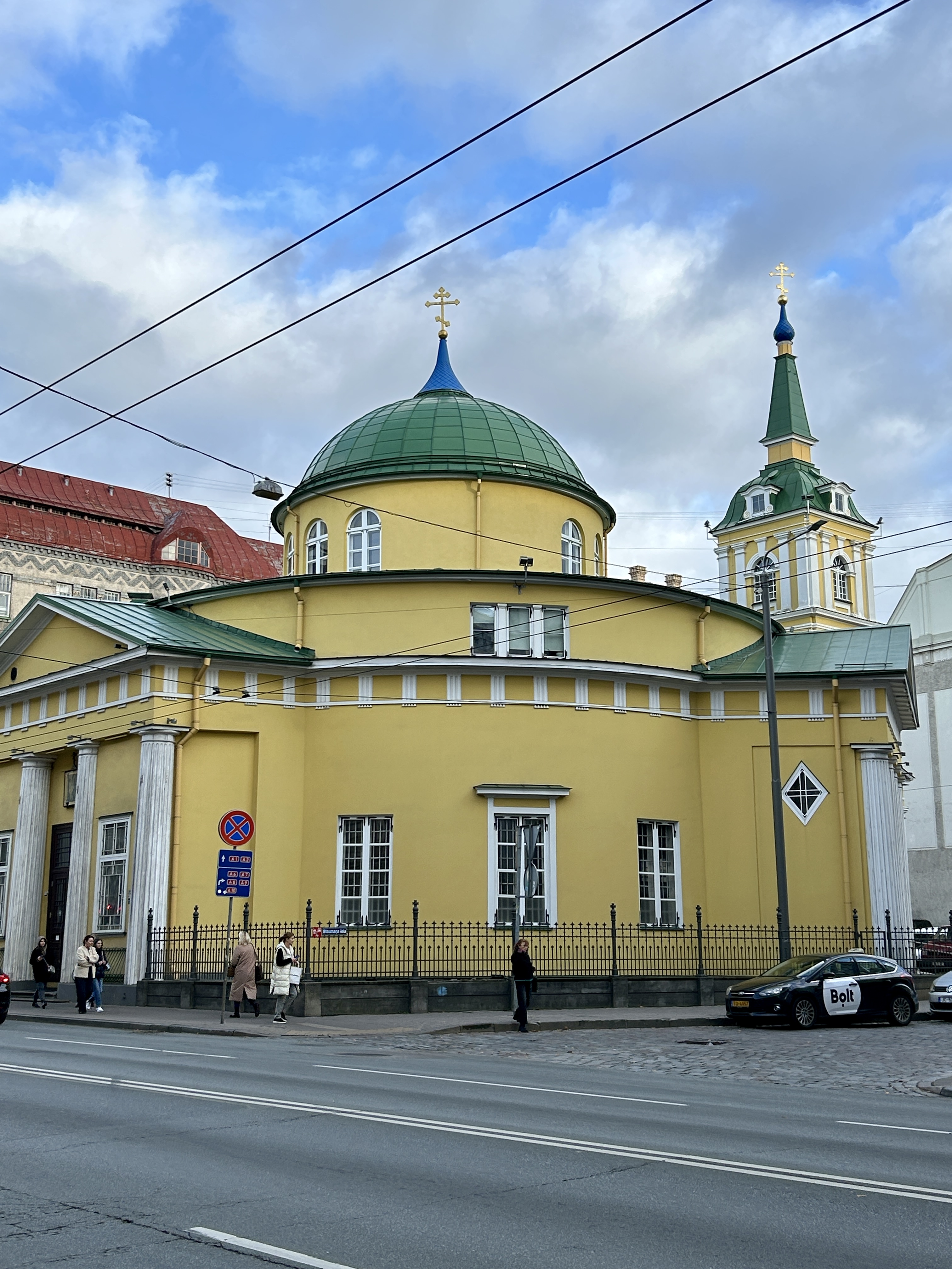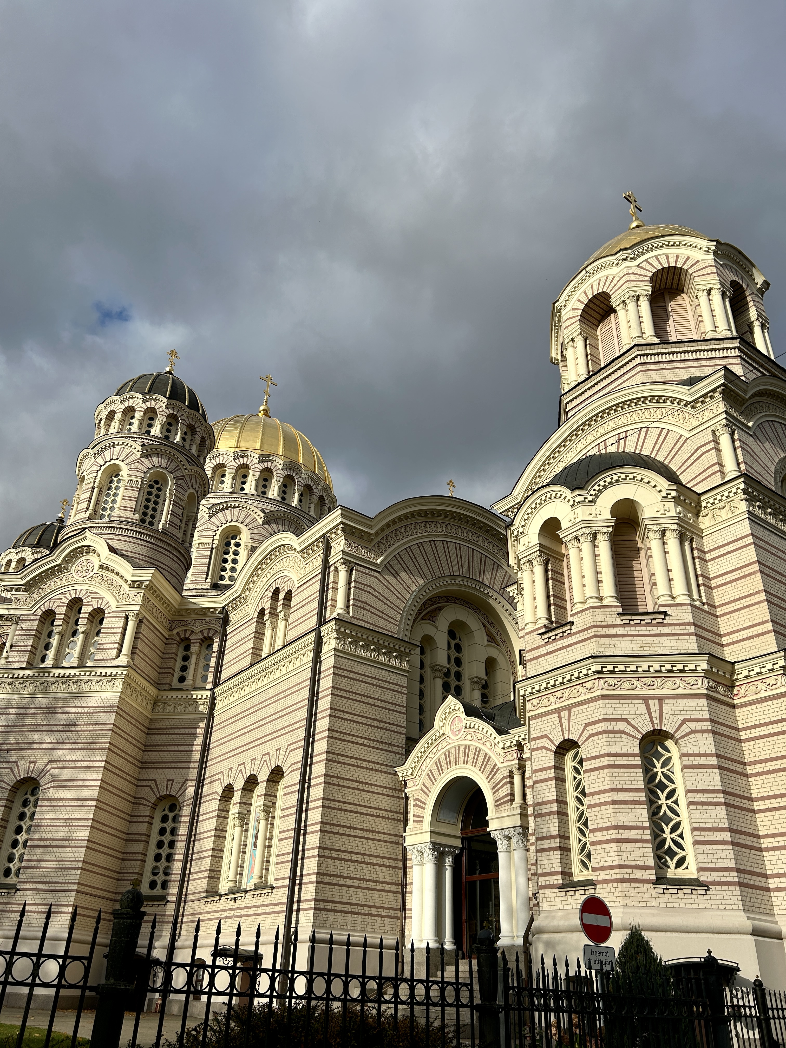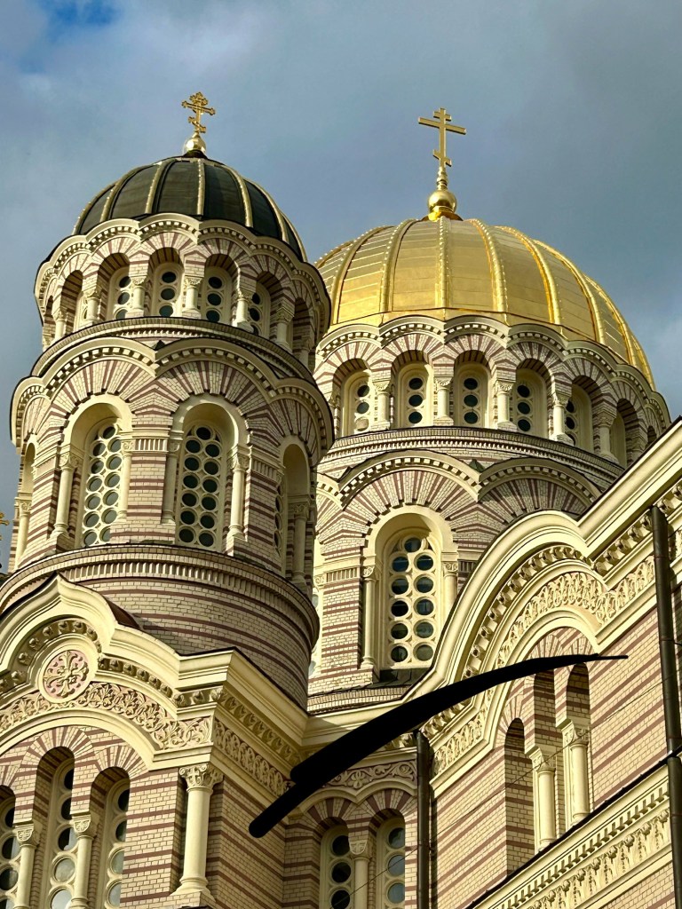 From there I could see the beautiful golden onion domes glinting in the sun, so I knew our next stop was near. The Russian Orthodox cathedral had again called to me; and this one did not disappoint. The outside looked like a beautiful fancy cake, whereas inside was a riot of gold and blue. Photos were again forbidden inside, but it was incredible, with a huge high blue dome with Jesus looking down at you from it. The walls were lined with ornate gold icons. I think it was even more beautiful than the one in Tallin.