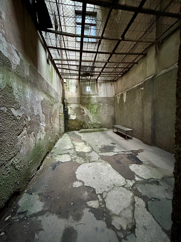 The first room we got to see was the booking in room. Photos lined the wall, of those who had never found freedom. The whole point of the prison was to get signatures confessing to crimes, so that these documents could be sent to Moscow. There were around 40 cells, which could hold hundreds of priosners at a time. There were 22 of us on the tour, and we sat cramped in one of the biggest cells. This cell would sometimes hold thirty men, who would spend all day and night there, apart from their half hour of excercise in the tiny exercise yard. The lights were kept on permanently, and there was one toilet bucket in the corner. The temperature was kept at 35 degrees, summer and winter. Everything was designed to break the prisoners into confessing. There was a red carpet outside the cells, so that the prisoners could not hear the footsteps of the guards approaching. It was red so that the blood didn’t show so much. The conditions were horrendous, especially in the standing cells where prisoners were unable to sit or lay down.