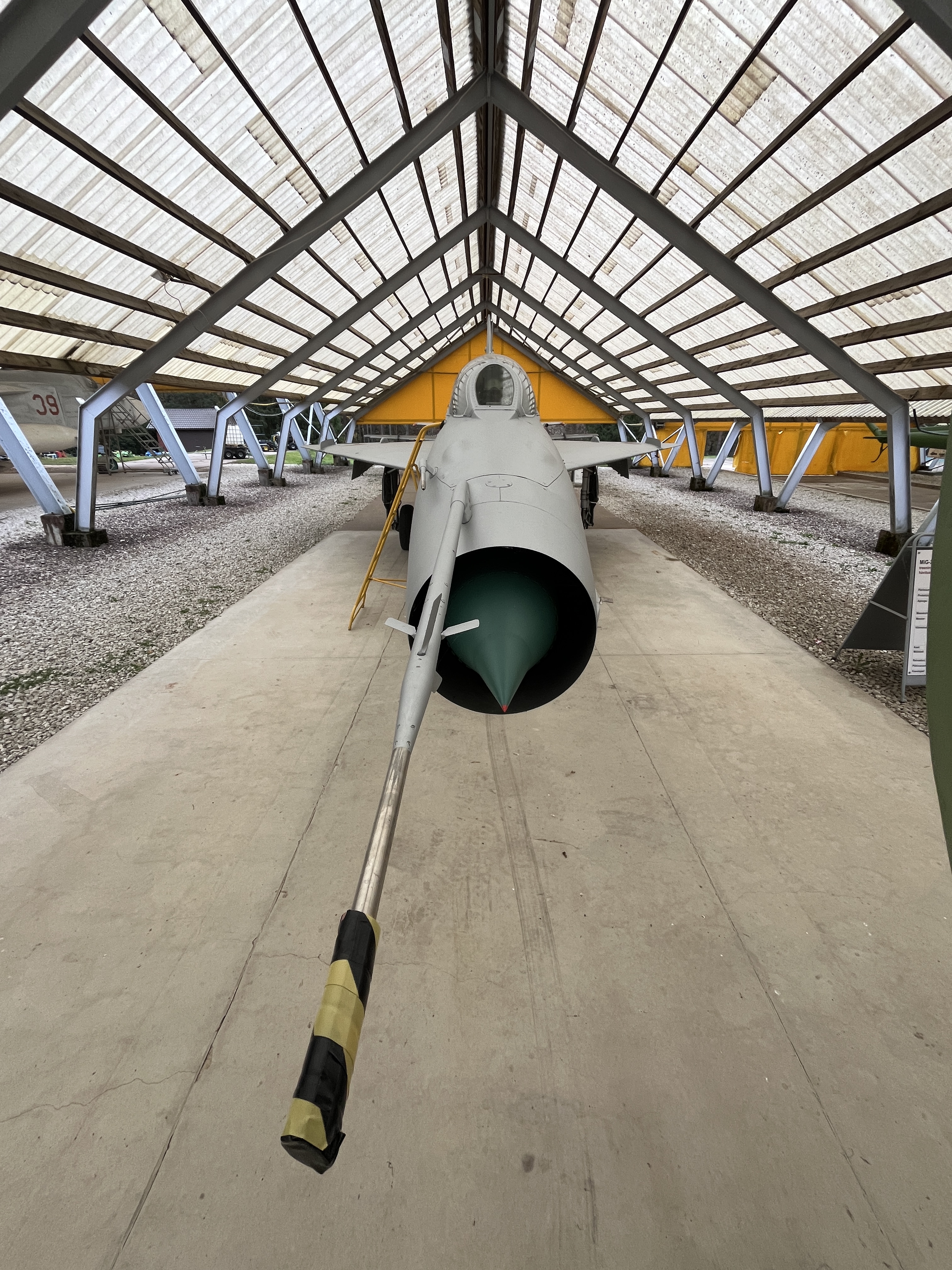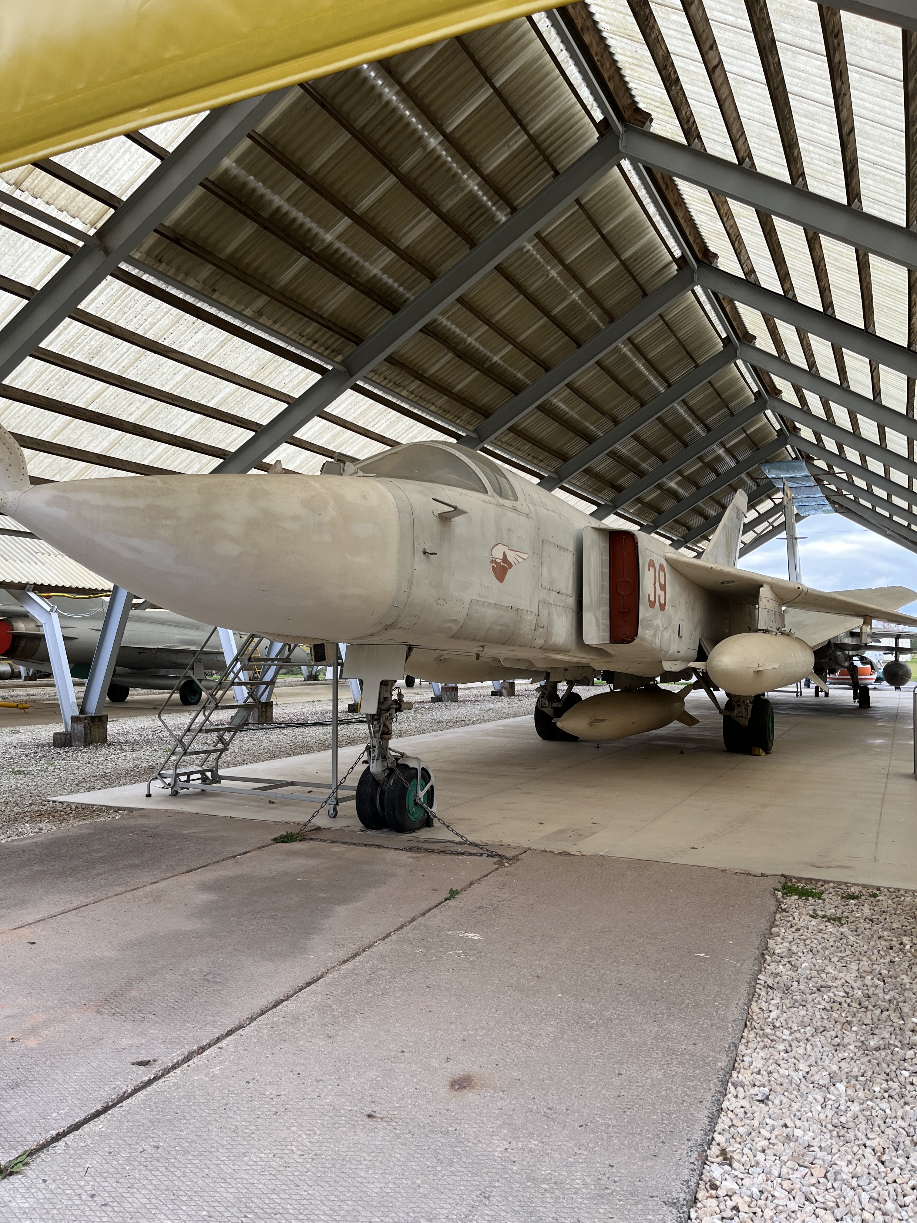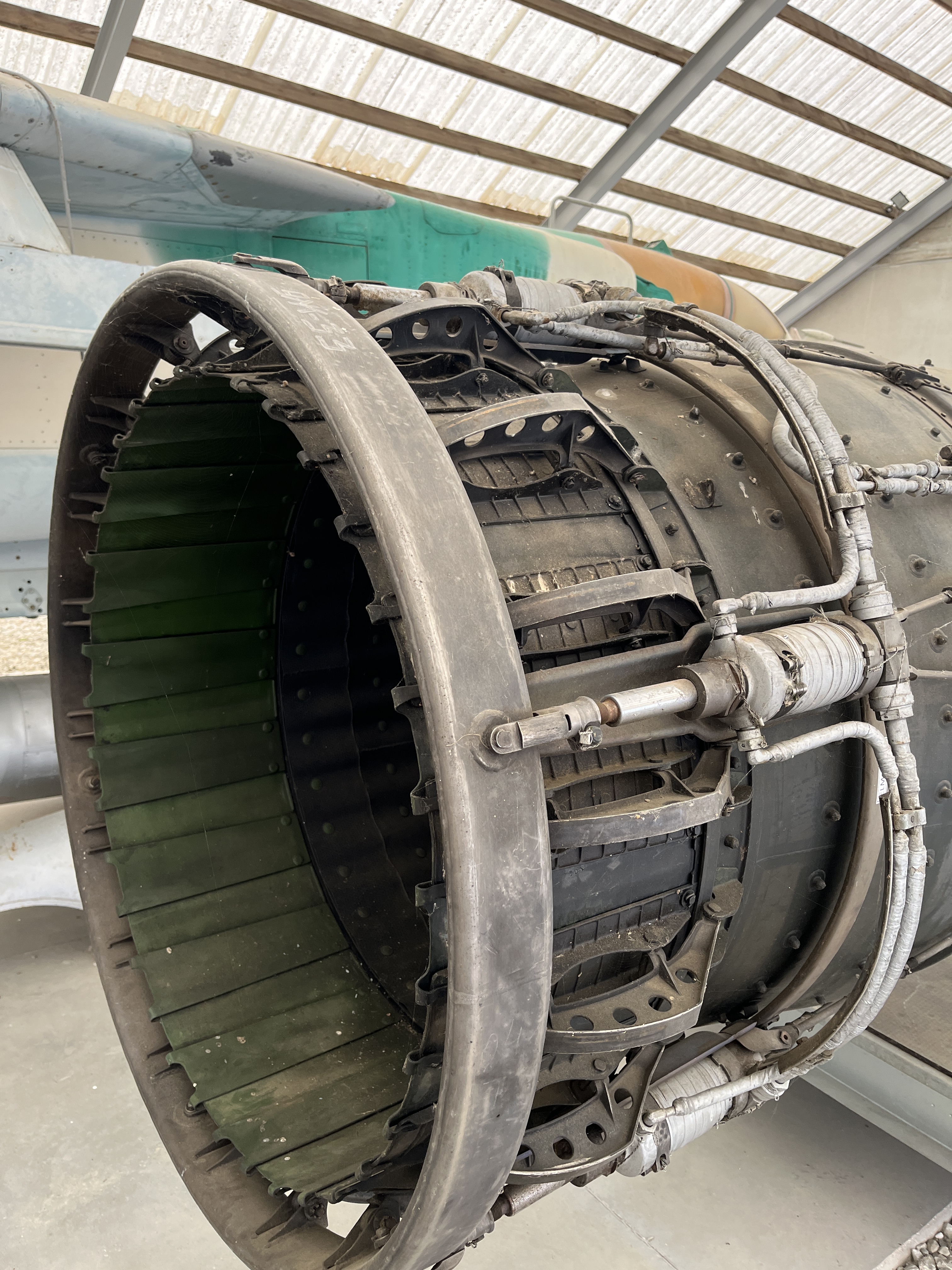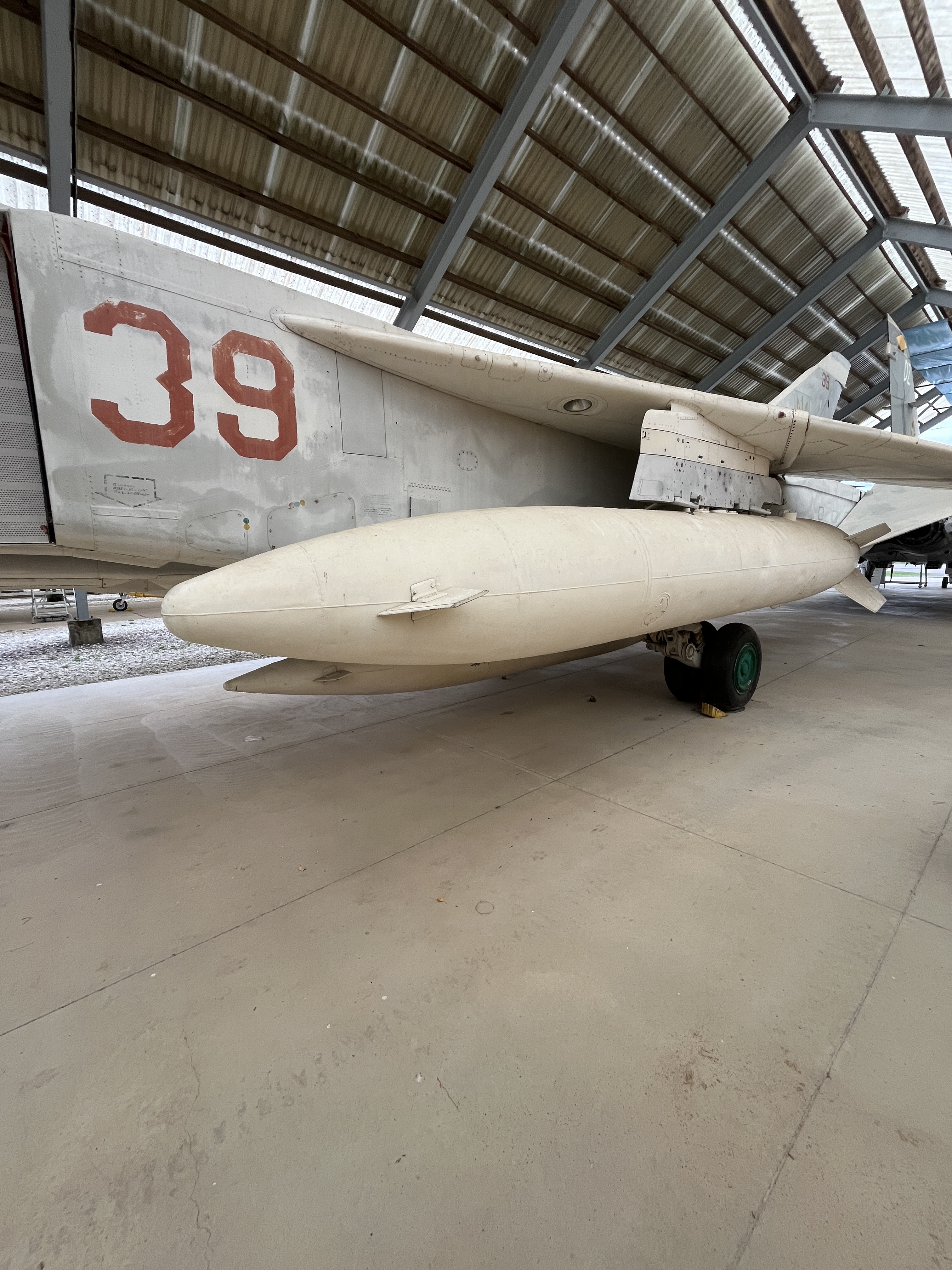 Its first flight was in 1964, and at a max speed of Mark 3.2 (3,470km/h) apparently, the fastest production aircraft in the world. This thing is ALL engine…. Just air in and air out ….. With a 36t take-off weight and an empty weight of 20t, it could carry a lot of armaments. A huge aircraft that dominated the little MIG-21 parked next to it. Looking into the cockpit was so fascinating.