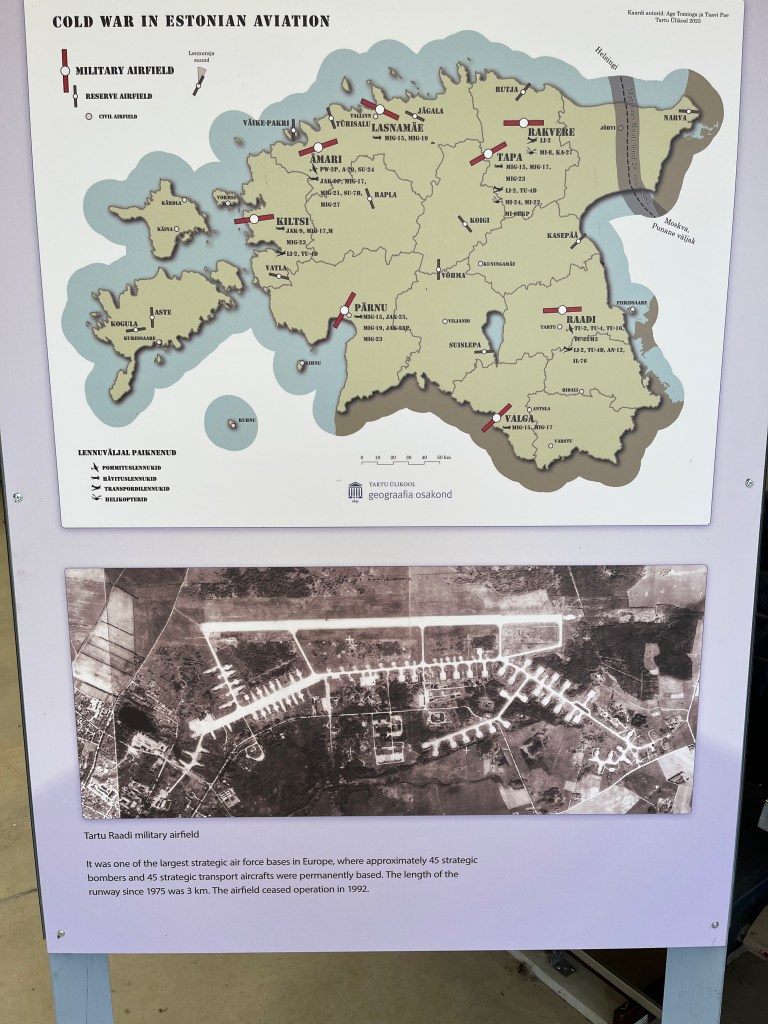 As Tartu was situated close to the Russian border and well inland, it allowed the Russians to place 6 or so MIG (interceptor and fighter) bases along the coastline of Estonia, therefore protecting any attacks on Tartu and defending the periphery of Eastern airspace. I have no doubt that the Tupolev and Illysian bombers based here have flown close to UK airspace !!