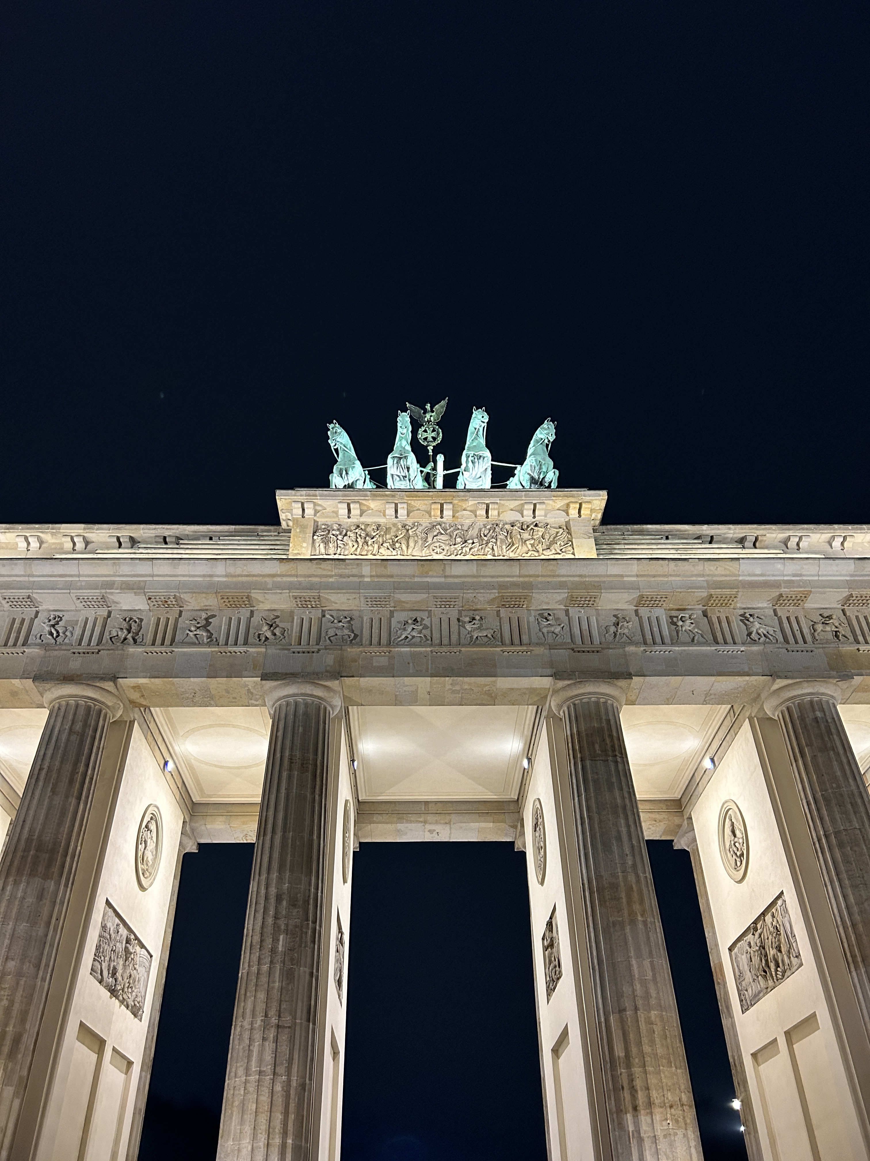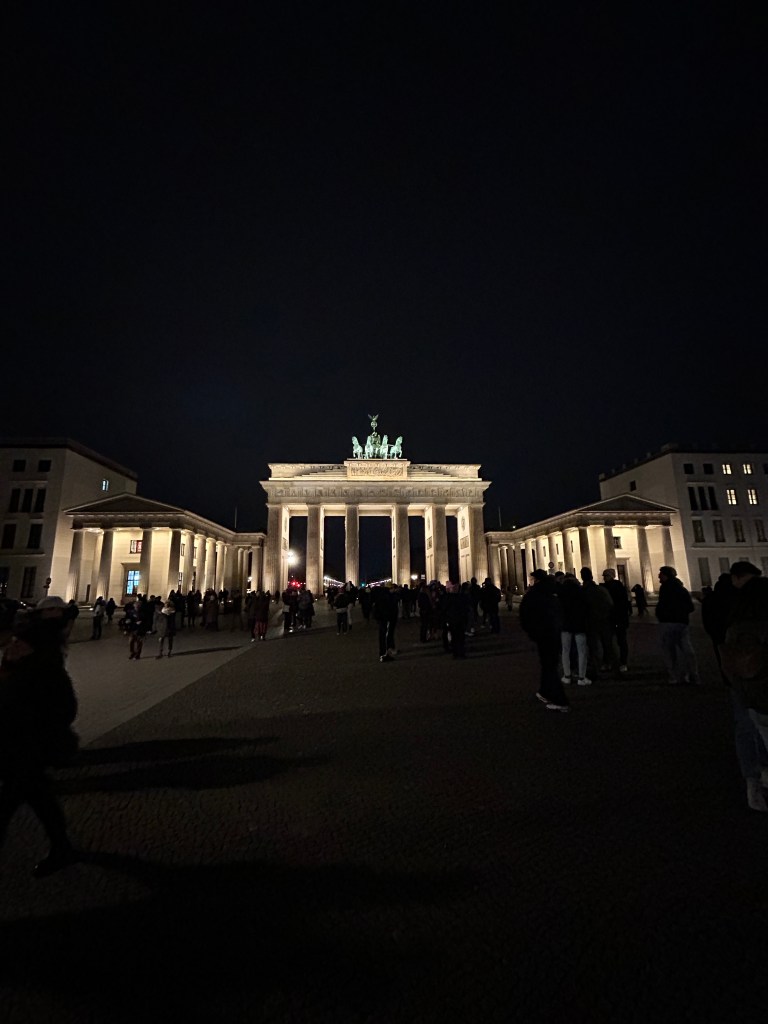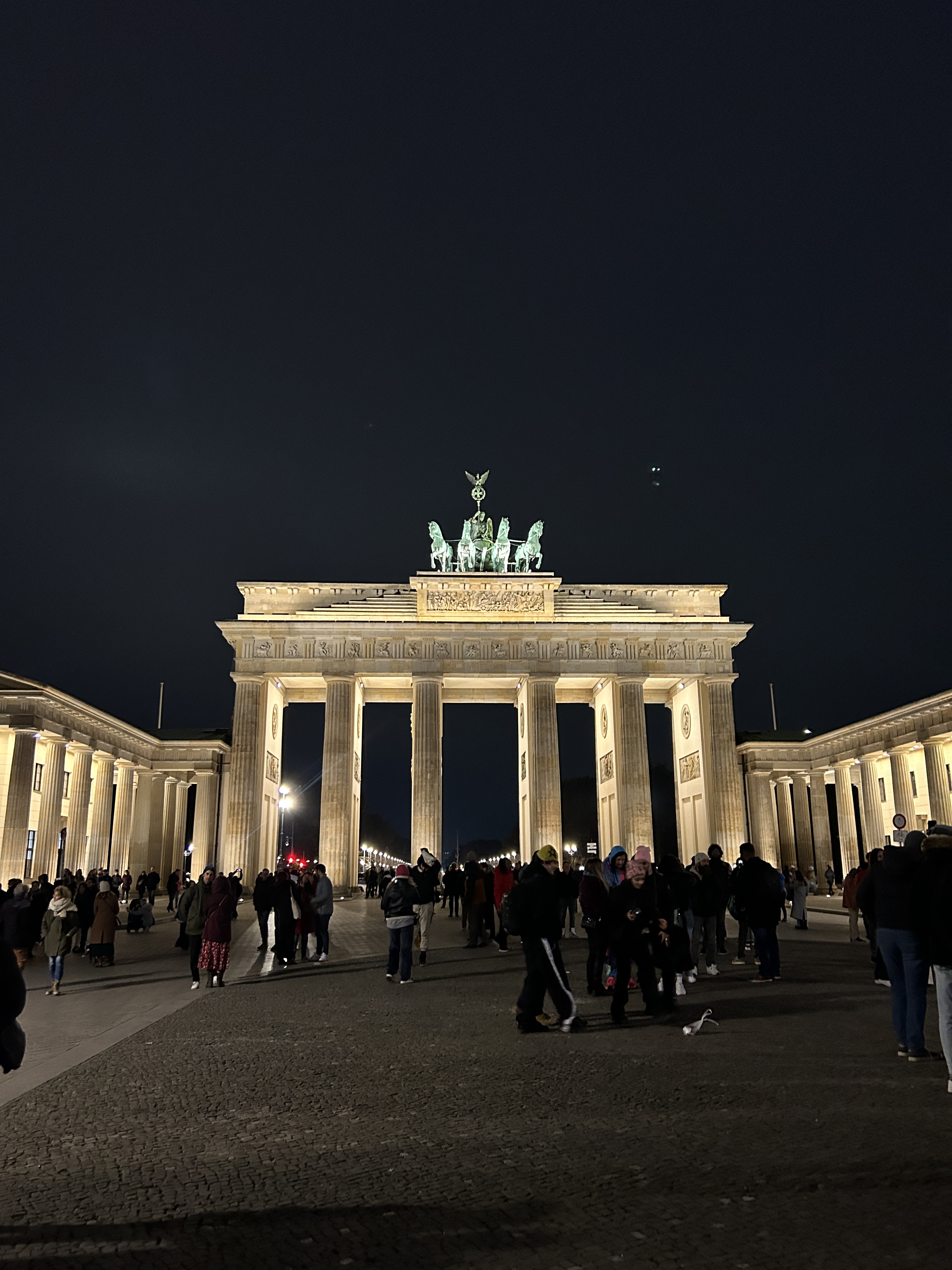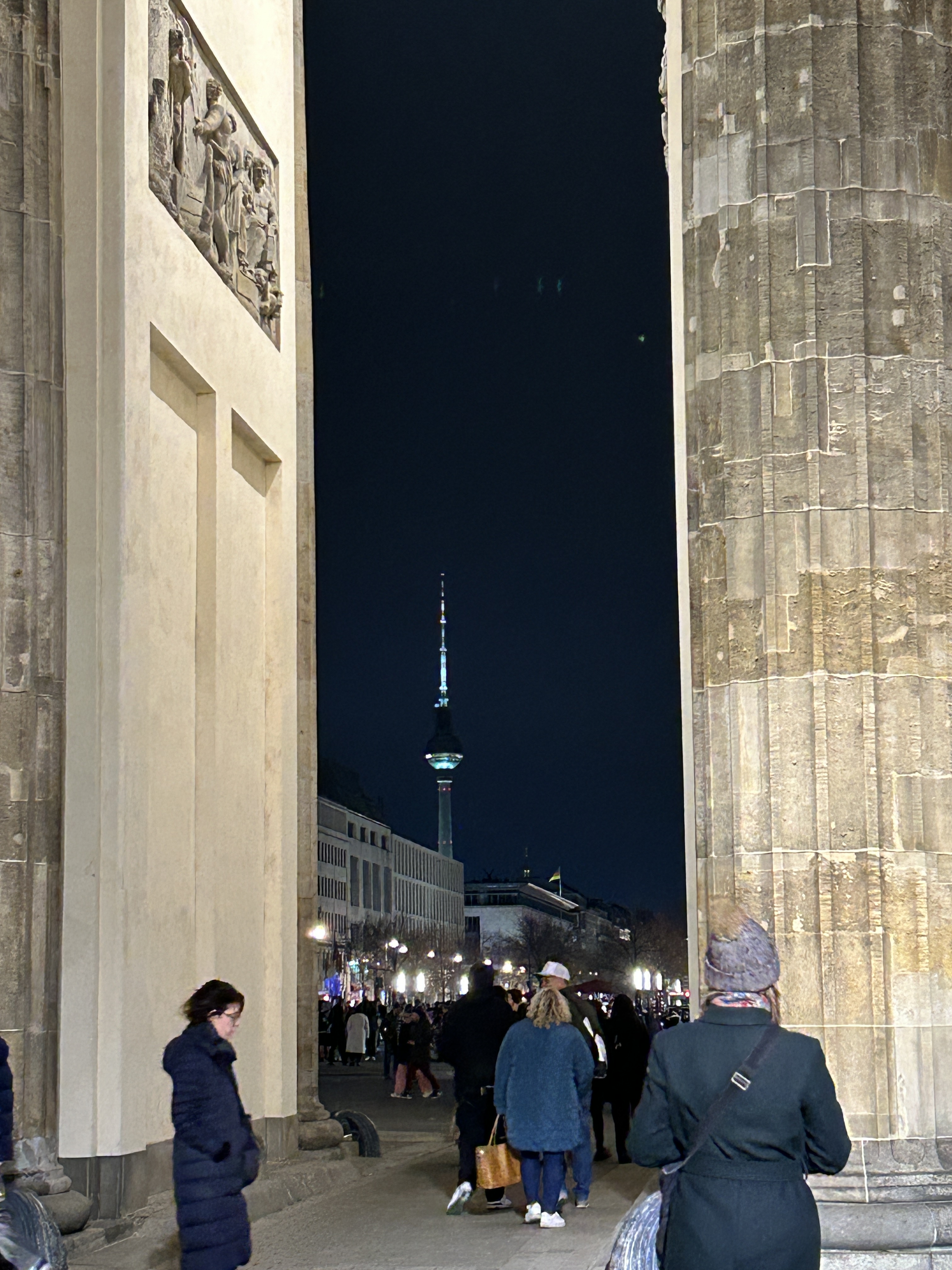 After visiting busy Alexanderplatz which Lyn was desperate to see after it being mentioned in so many of his spy novels, we went over to see the Brandenburg Gate, which was all lit up. This was inspired by the Acropolis in Athens and was originally a symbol of peace which later became associated with political power under Napolean and the Nazis. It became a symbol of division during the Cold War and was celebrated as a symbol of unity after the fall of the wall in 1989. It is right next to another of Berlin’s iconic landmarks, the Reichstag (Bundestag). This was built between 1884-and 1894 as the seat of the German parliament and was heavily destroyed in WW2. It was restored and reopened in 1999 and is famous for its huge glass dome.
