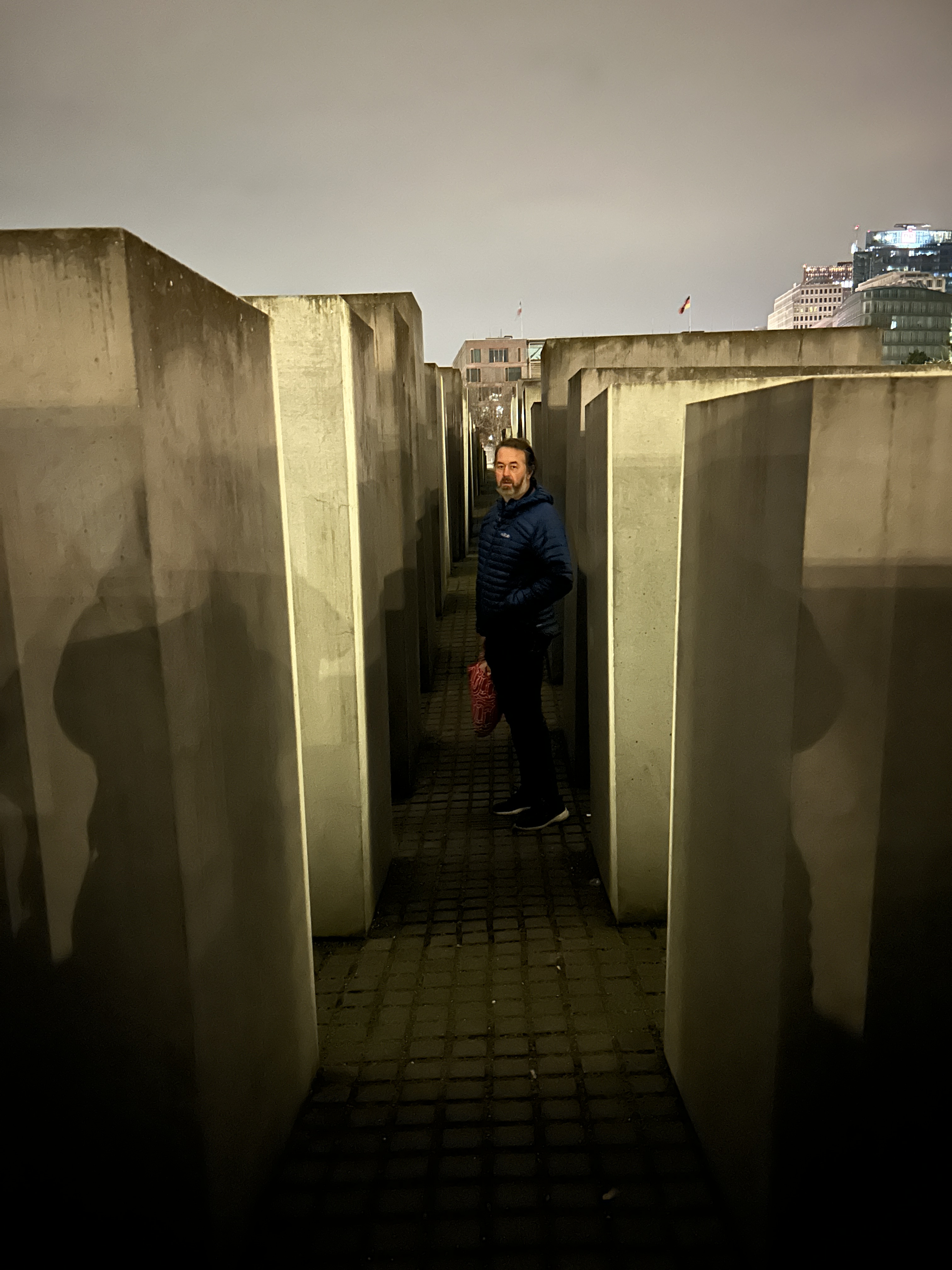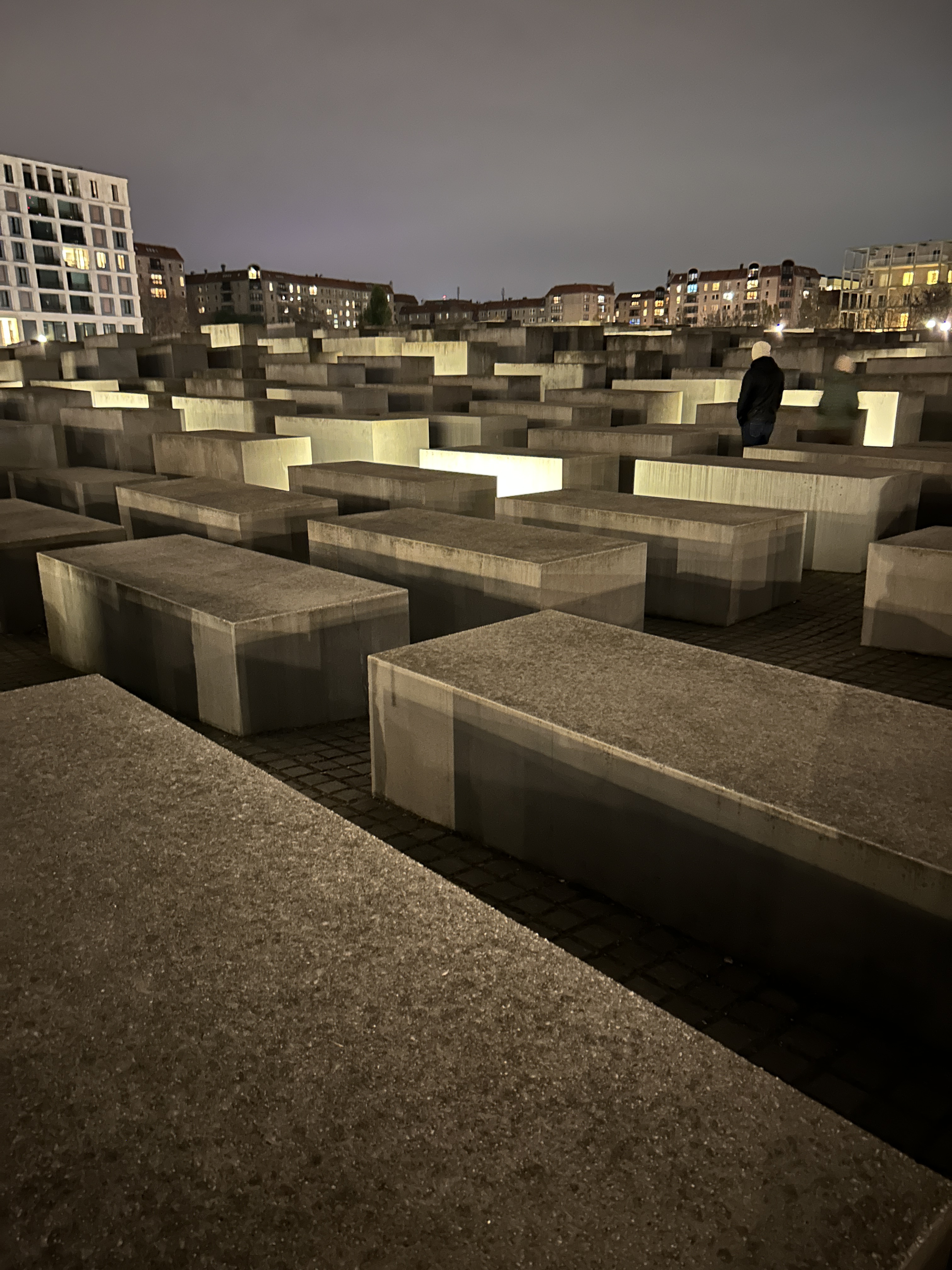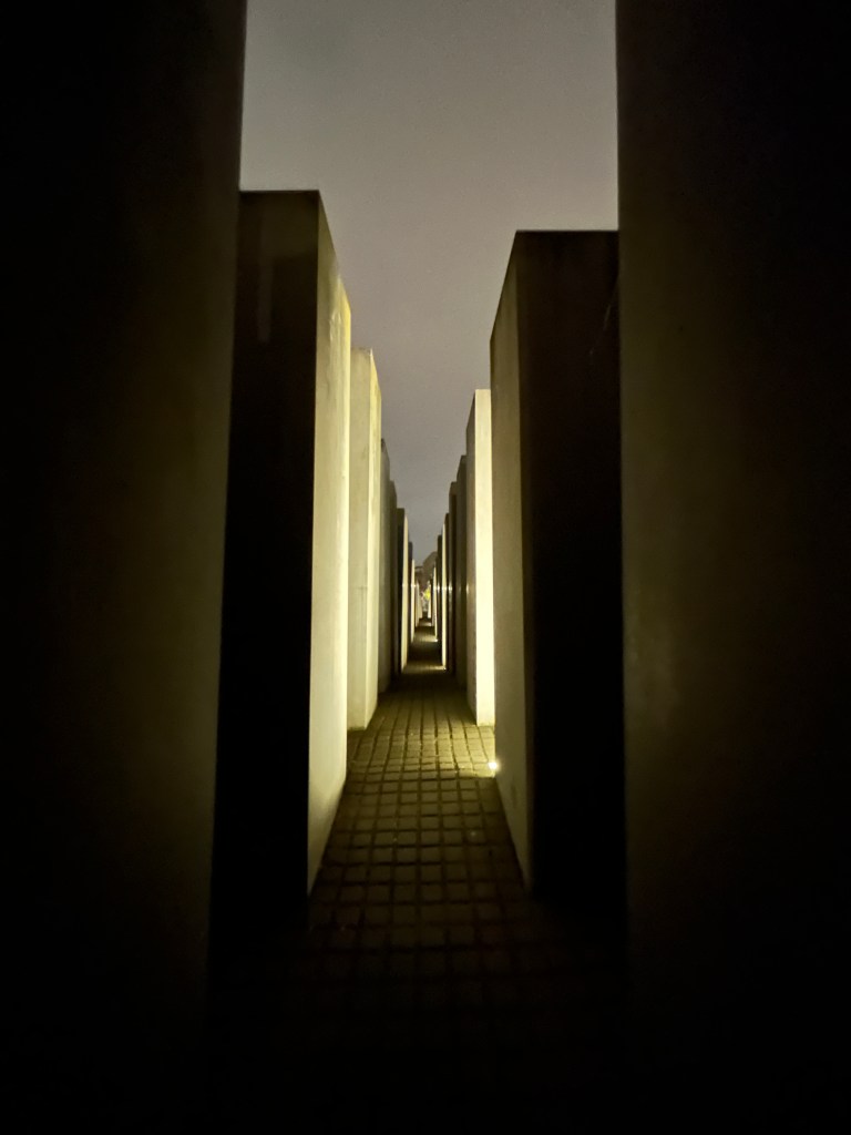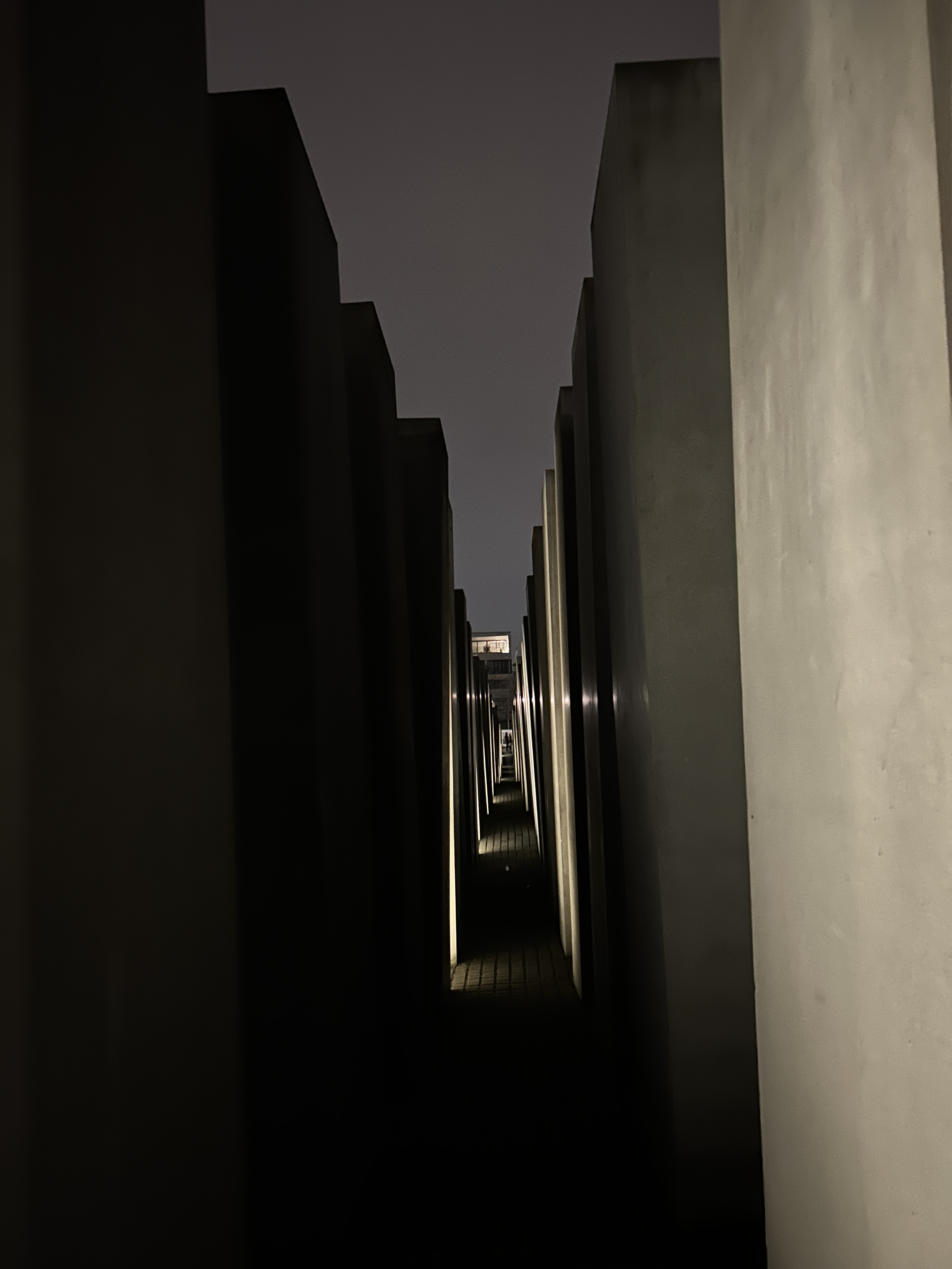 This area also houses the Holocaust Memorial (The Memorial to the Murdered Jews of Europe), which is a powerful tribute to the 6 million Jewish victims of the Holocaust. It covers an area of 4.7 acres and consists of 2,711 concrete slabs, (stelae) of varying heights arranged in a grid pattern. They all have a uniform width and length but vary in height from 0.2m to 4.7m. I didn’t like it and felt very uncomfortable there, especially as we were there in the dark, and not all the stelae are lit. It is almost like a symmetrical maze, and means that as we were walking, other people taking a different route through would suddenly pop out of the shadows like sudden ghosts. I found it disorientating and disconcerting, which is maybe the desired effect to symbolize loss and isolation.