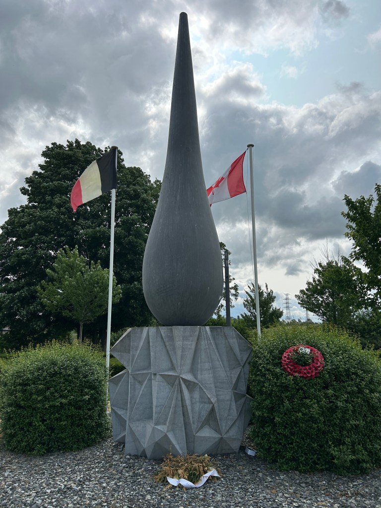 We carried on over one of the bridges and walked down the other side to visit the immaculately kept monument for Private George Price, who was the last commonwealth soldier killed in WW1, 2 minutes before the ceasefire at 11am . He was shot by a German sniper when he stepped out in to the street. George was Canadian and the Canadian flag flies proudly above the monument, which symbolised a drop. This can be seen as a drop of blood or a teardrop. The sculptor came up with his design when he was given a piece of blood stained cloth that had been preserved from George’s blood soaked uniform. His name will forever live on, as they renamed the footbridge over the canal at that point to honour him, and also the local school takes his name.
