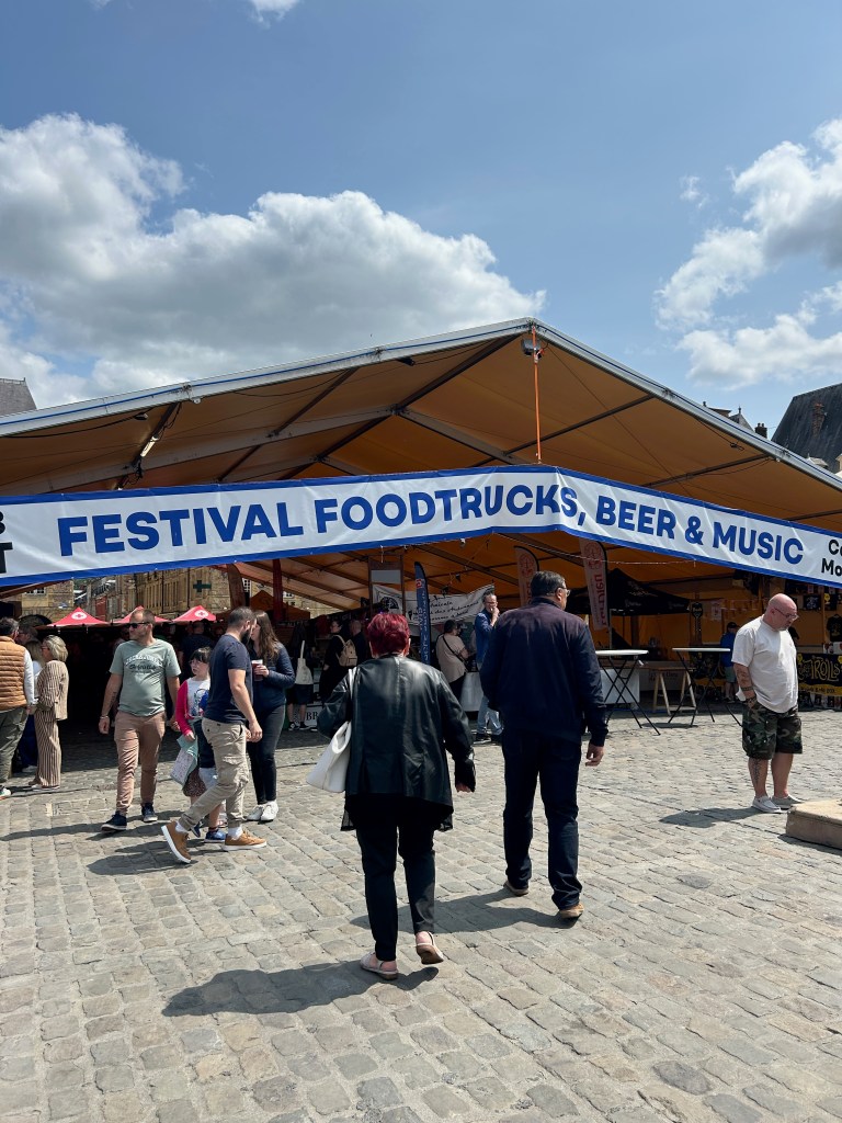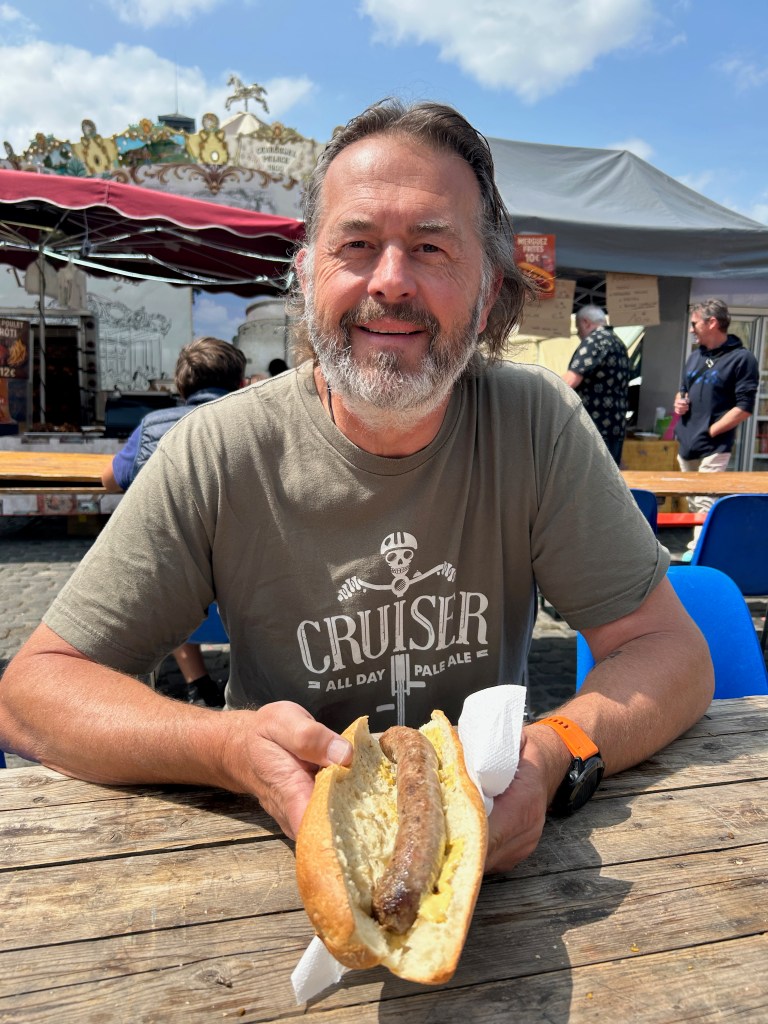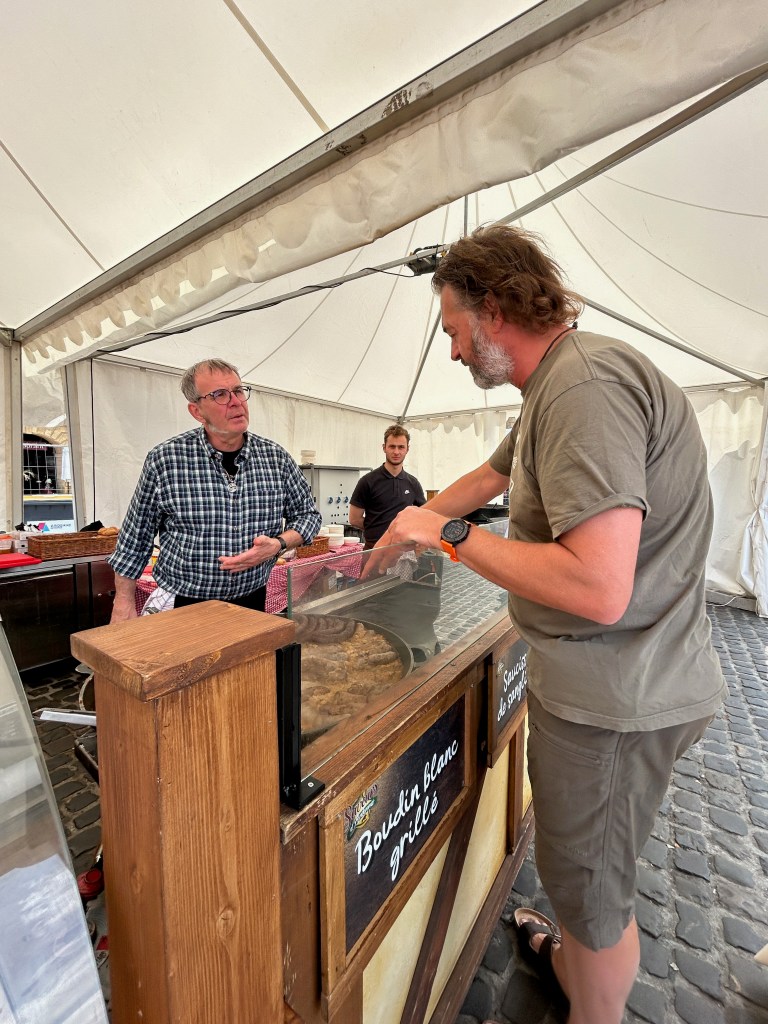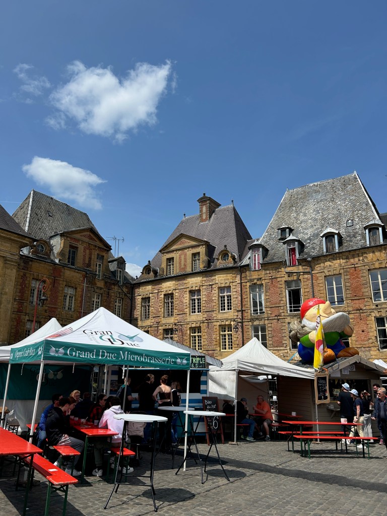 After lunch we walked into the nearby town, which was only about 5 minutes walk, across the river. I was desperate to see the big square, or the Place Ducale. When we got there, to our amazement it was full of, wait for it, a beer festival! Our French angel really sent us to the right place! Lyn thought he’d died and gone to heaven, especially when he found a sausage stall!