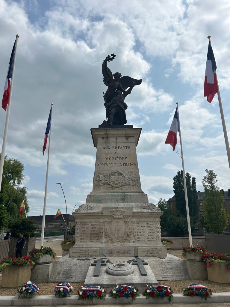 It was the last day of the festival, and the square was heaving with people enjoying the sunshine and, of course, some of the 165 beers on tap offered by 57 breweries. Lyn had a drink or two then we walked through the town of Charleville and across the bridge to the town of Mezieres. The two towns merged in 1966, and are famous for puppetry, including a puppetry school and international puppet festival. Not for me, thanks, puppets are creepy! We stopped to admire the Hotel de ville in Mezieres and walked back to Charleville to find a bakery that was open. So many shops were closed on a Monday. We found a gorgeous bakery and I had a fabulous Moka ( coffee) cake and Lyn had his ultimate favourite, flan.