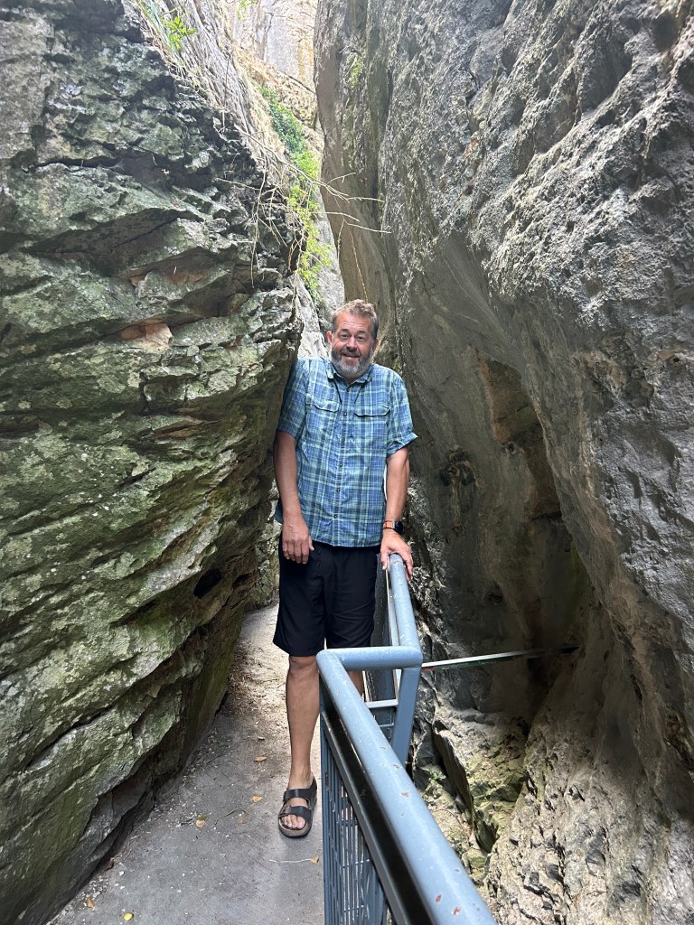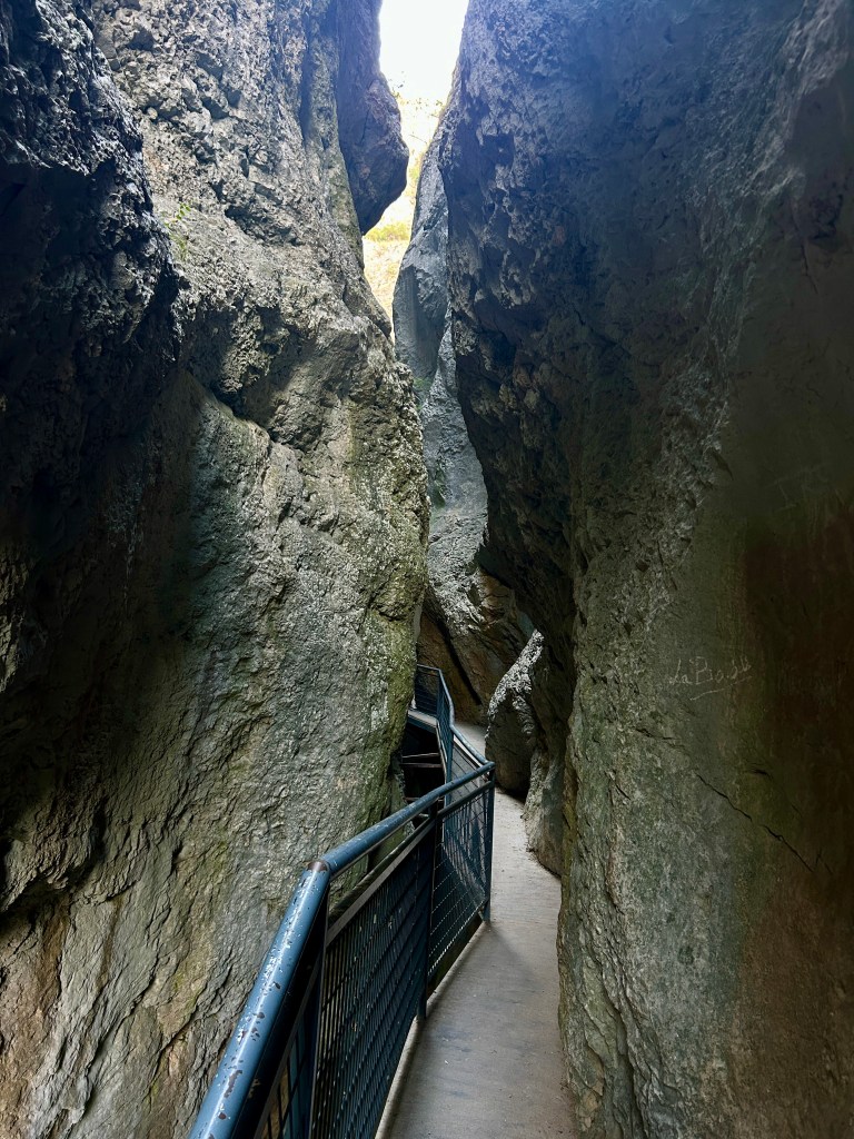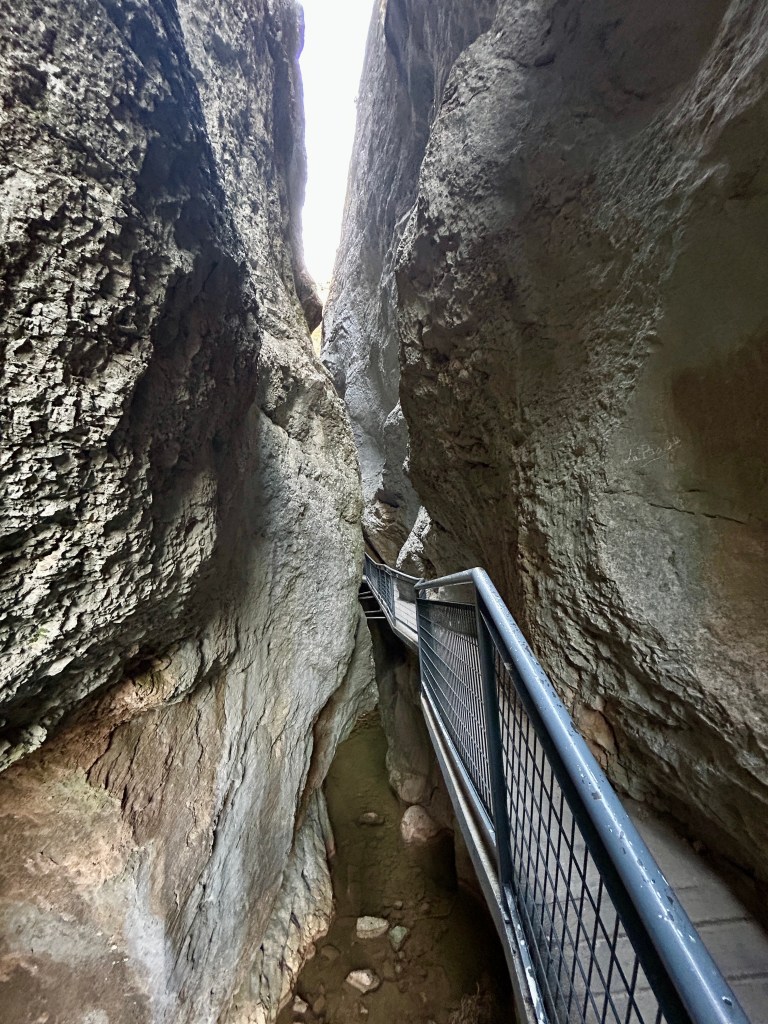 The gorge walk is made up of a walk-way that clings to the cliff walls above a rushing stream. The slot canyon is so tight I had to turn sideways at times, and you can easily touch both sides of it at once. It was fascinating to look down and see larger logs suspended high up, from where high water levels had left them stranded. It must be so cool to see it in full flood. I absolutely love slot canyons, and have been lucky to visit many in Utah, Nevada and Arizona, so it was fabulous to see one much closer to home. Luckily Lyn didn’t get stuck in this one and need rescuing!