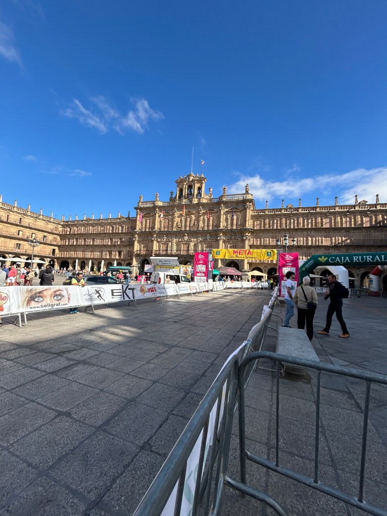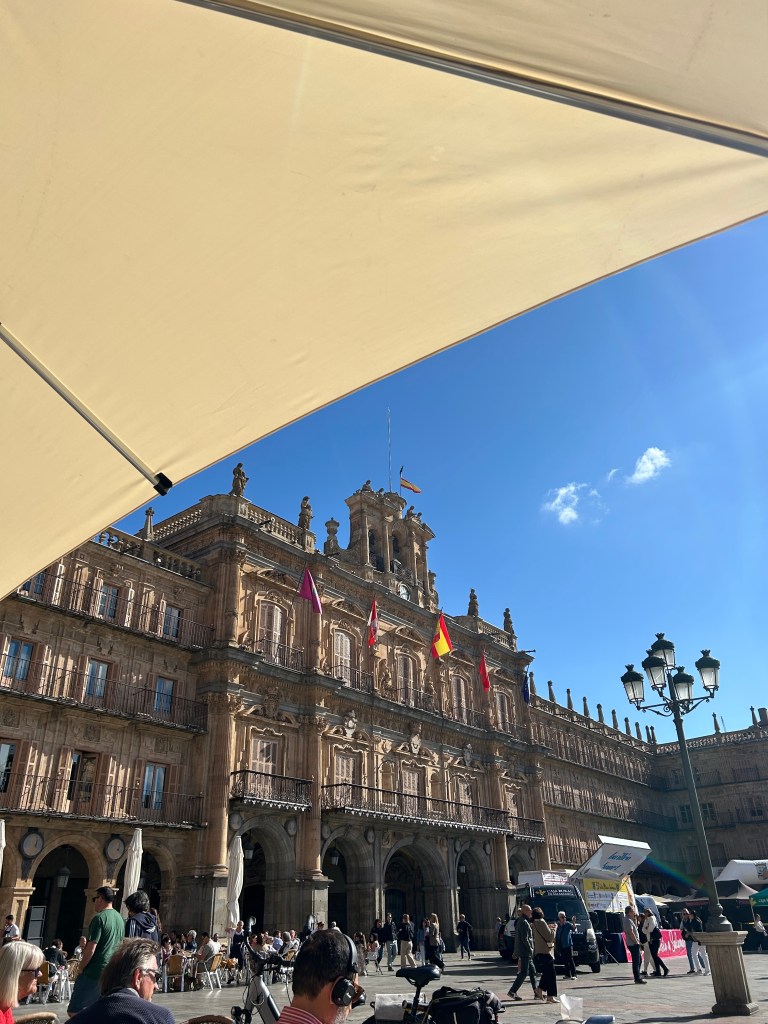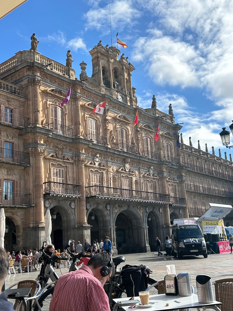 Even though I am trying not to visit too many cities Salamanca was one I decided was worthy of a day’s visit. We caught the bus from outside the park up, and headed in. The city is beautiful, with gorgeous warm sandstone buildings that glow in the sun. We started in the Plaza Mayor, the grand heart of the city. It is enormous, and the central square is enclosed by a magnificent huge building and lined with cafes. We sat and enjoyed a coffee, just people watching, and listening to the music from a big bike race that was finishing in the square.