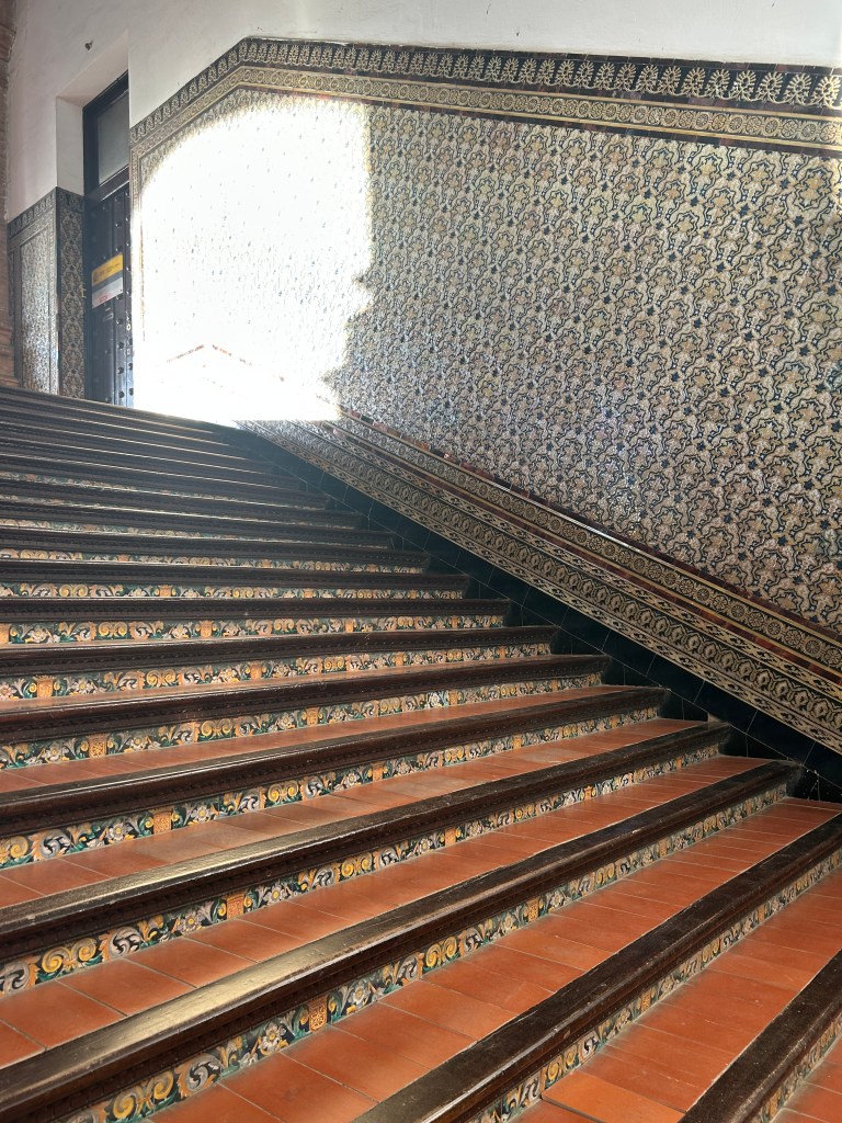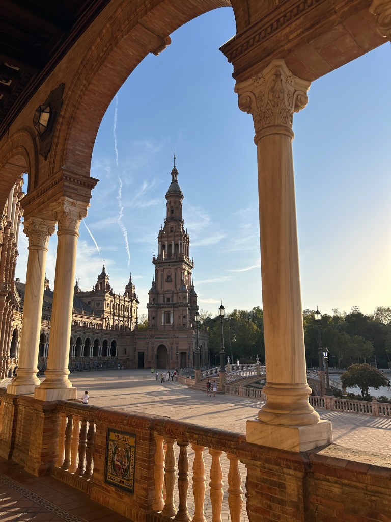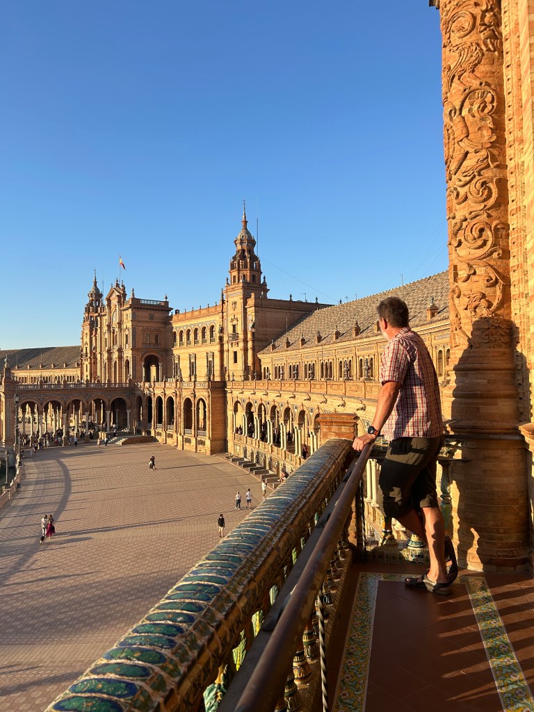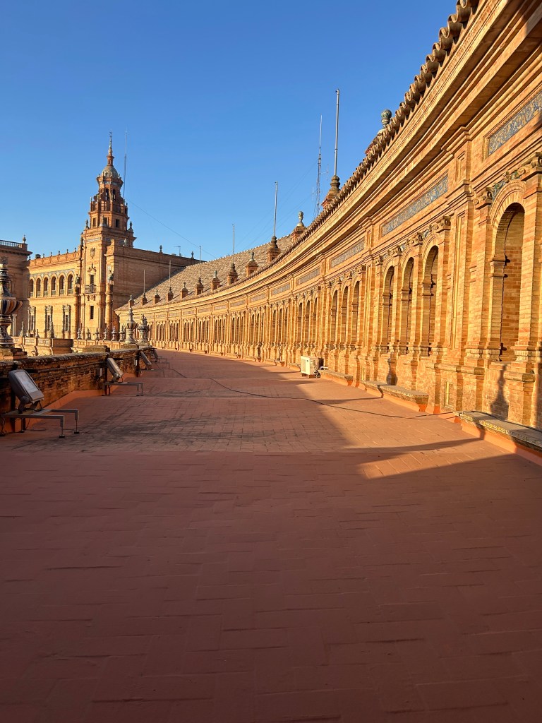 We had stumbled across the Plaza de Espangna. It really is the most gorgeous building, built in 1929 for the Ibero American Exposition. It’s a fabulous semicircular sweep of brick and colourful tiles that wraps around a canal crossed by ornate bridges. Each alcove has colourful tiles representing a Spanish province. We even stumbled across a group practising their flamenco, and two female dancers busking. I think it’s one of my favourite buildings, especially in the gorgeous light of the setting sun.