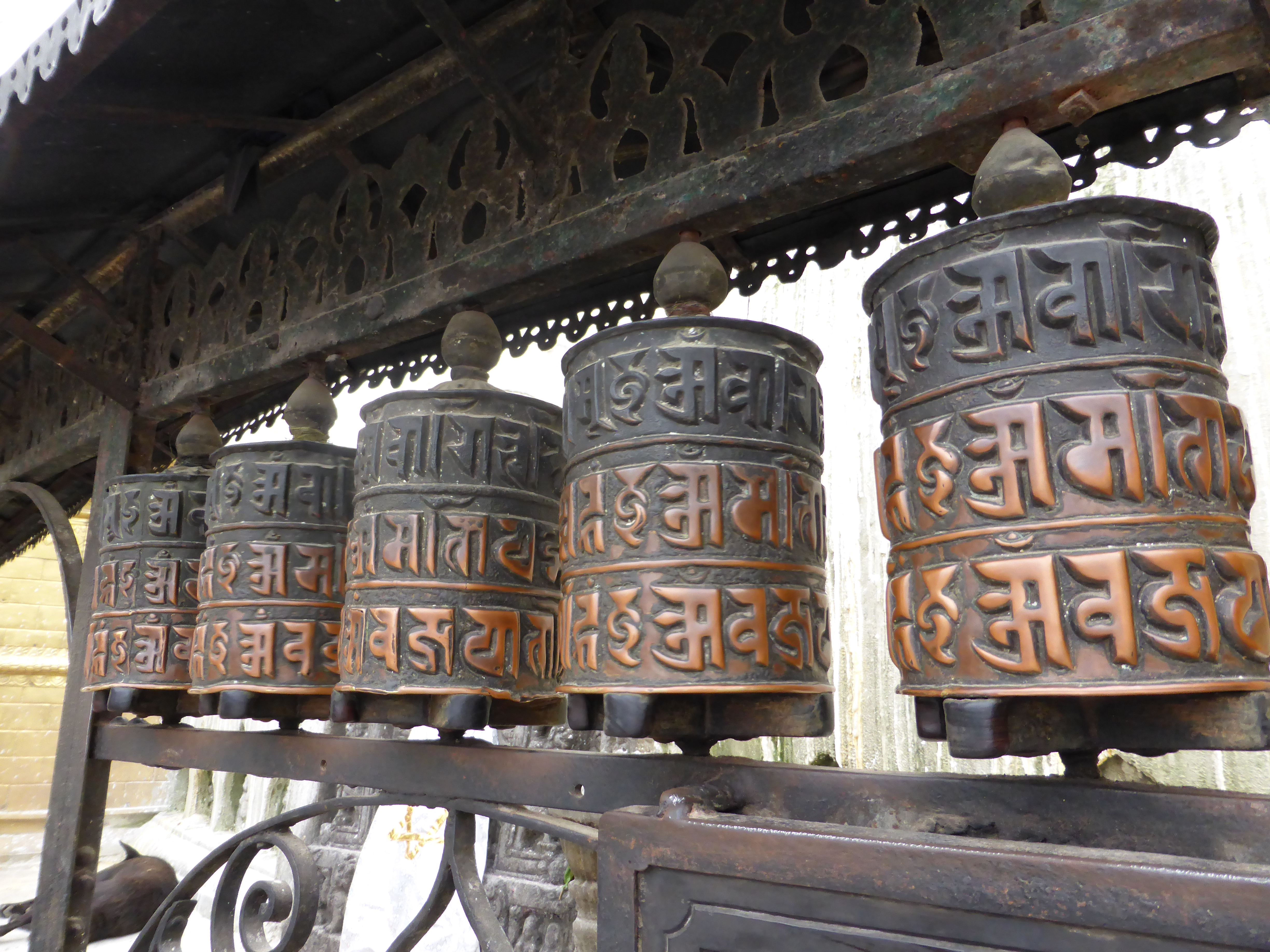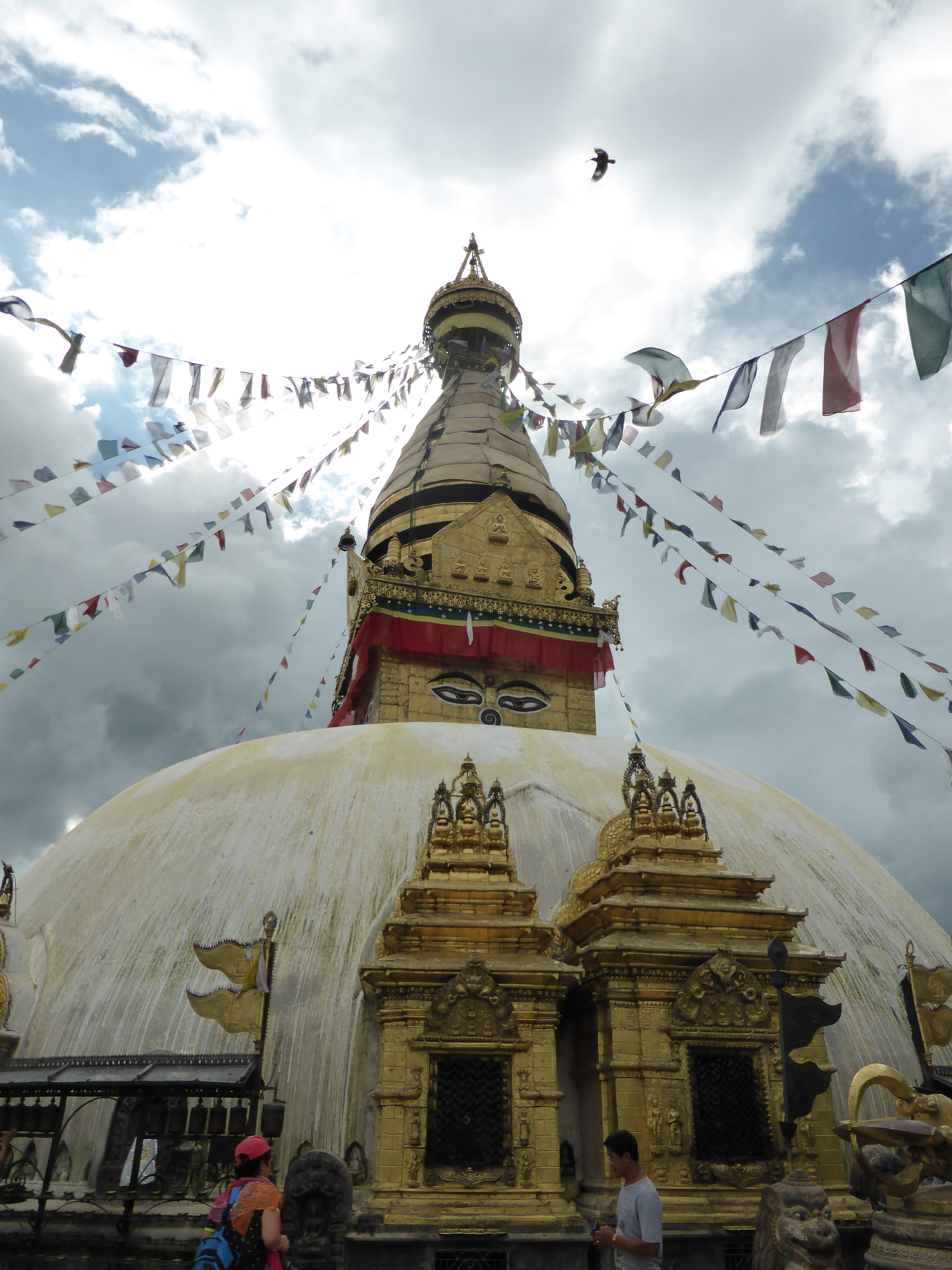 The all seeing eyes of the stupa look out over the whole of Kathmandu Valley, an amazing sight. I loved it there, once I’d got up the steps. It was fascinating to see how the Hindu and Buddhist religions co exist so harmoniously side by side. The all seeing eyes have a red Hindu tikka mark as well. There is something very special about circumambulating the stupa (always clockwise) and spinning the prayer wheels as you go (also always clockwise). Spinning creates more energy for your prayers. It was incredibly peaceful there. It’s a busy tourist spot but I didn’t see many tourists like me, they all seemed like pilgrims saying prayers, spinning wheels, ringing bells, lighting candles, blessing statues etc. It’s amazing to see how religion is such a natural part of everyday life here.