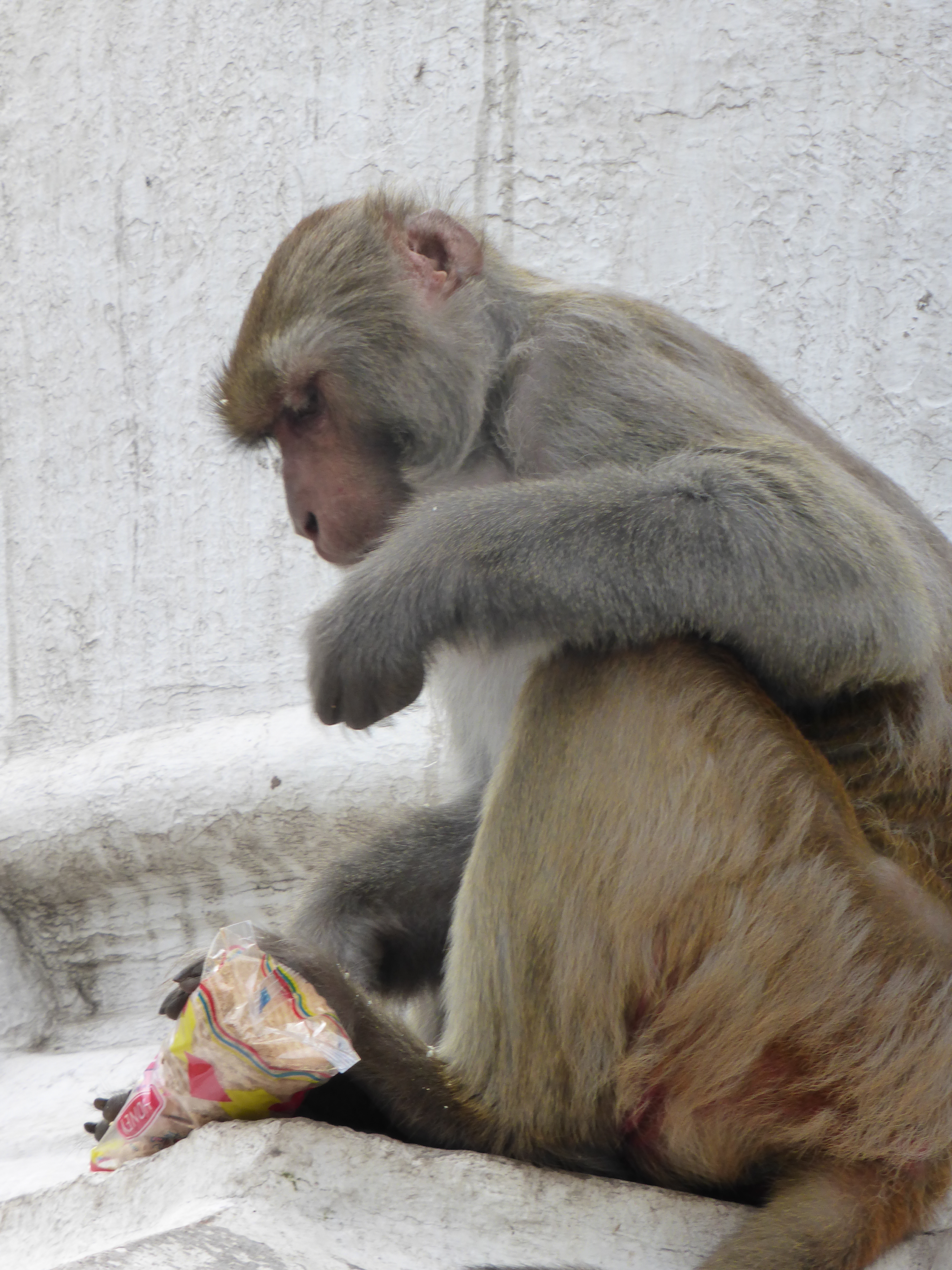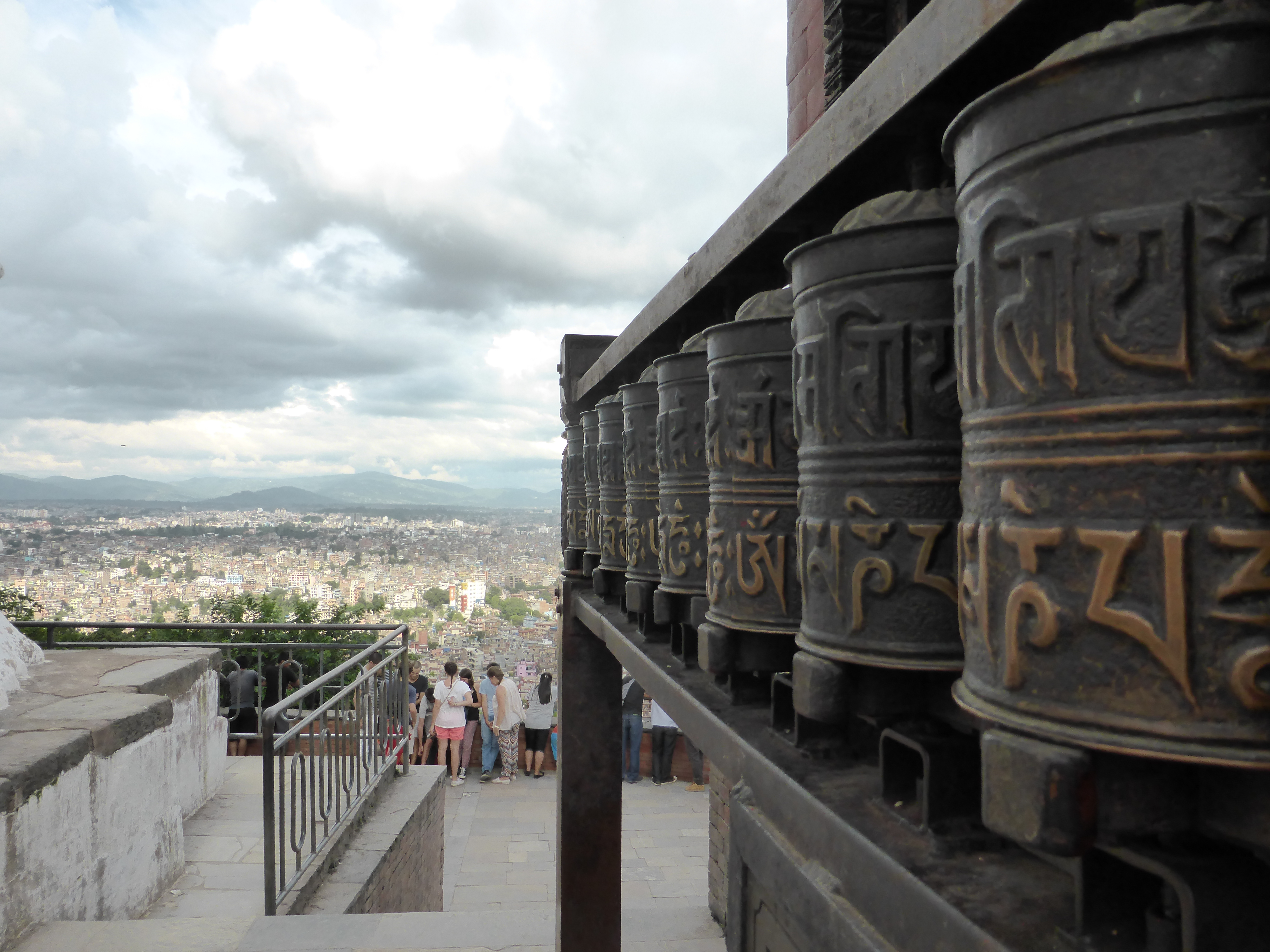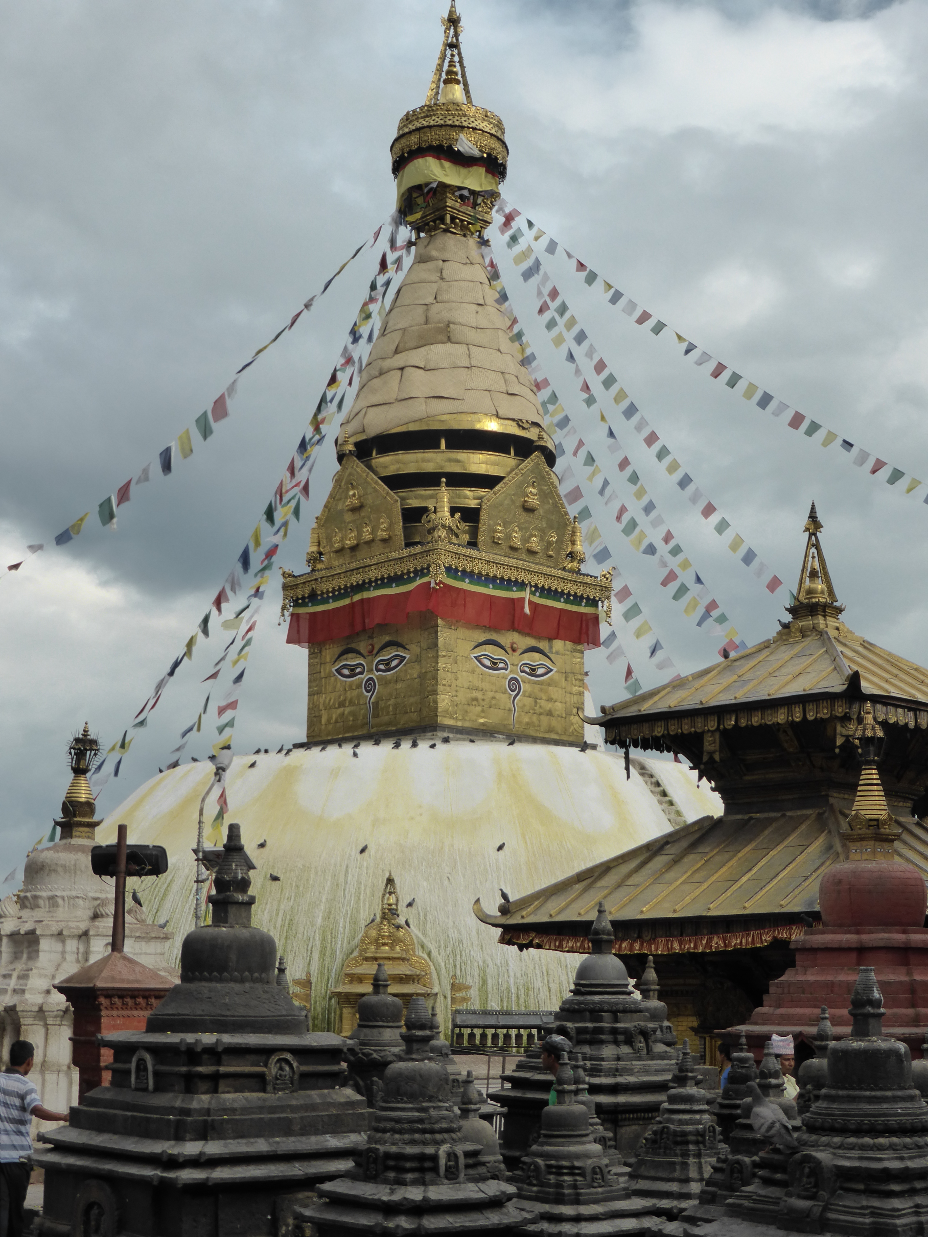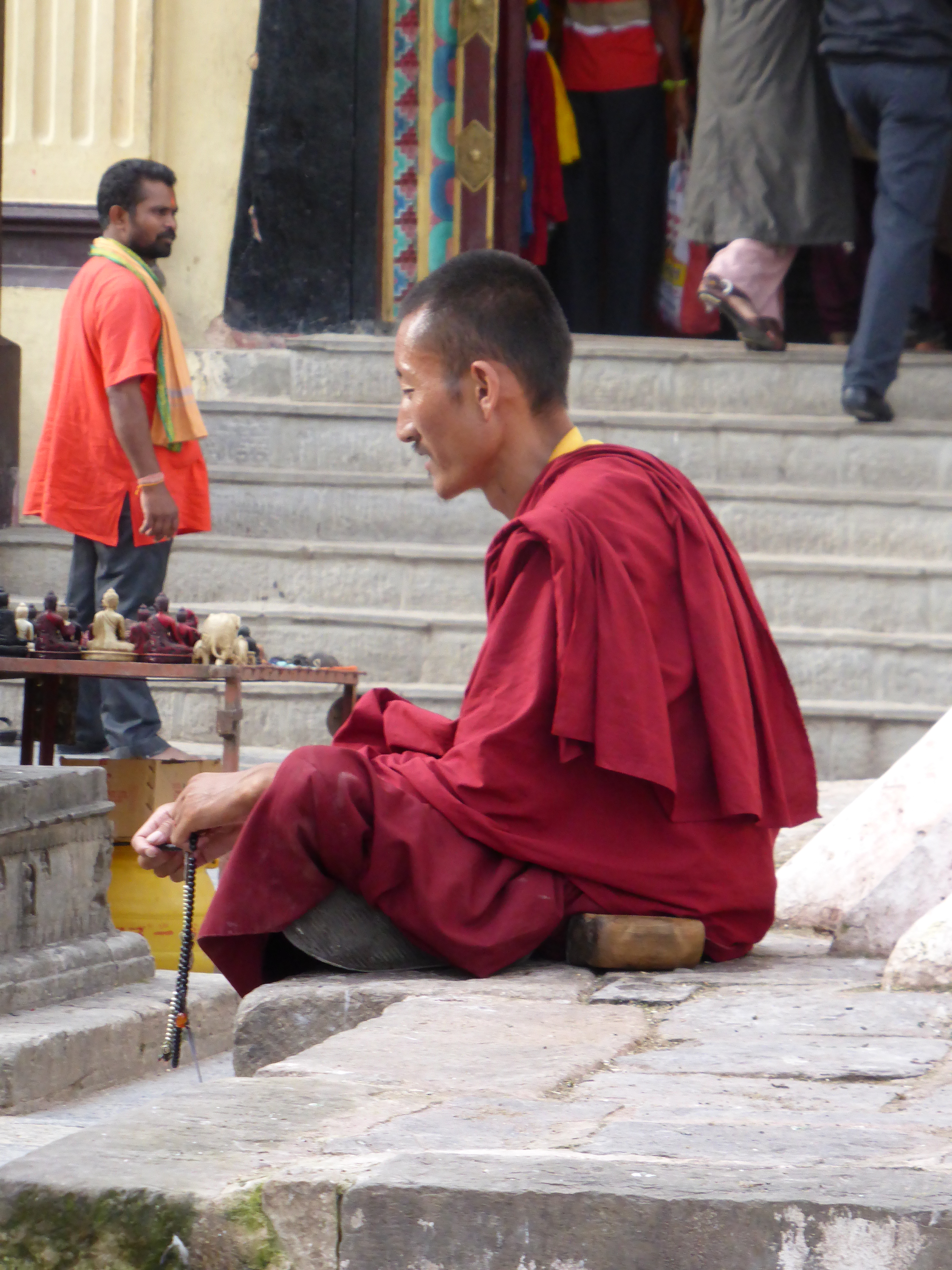 Sanju took me out sightseeing. We braved the usual chaotic traffic and took a taxi to the stupa of Swayamhunath, one of Nepal’s most sacred Buddhist shrines. It is also known as Monkey Temple, you can guess why! It is absolutely amazing a mish mash of prayer wheels, Buddha statue, prayer flags, Tibetan chapels and monkeys/ It’s surrounded by the obligatory stalls sending tourist stuff. It’s also really high up, up 300 steps. Not just 300 steps, 300 bloody steep steps in 29 degrees of humid heat!