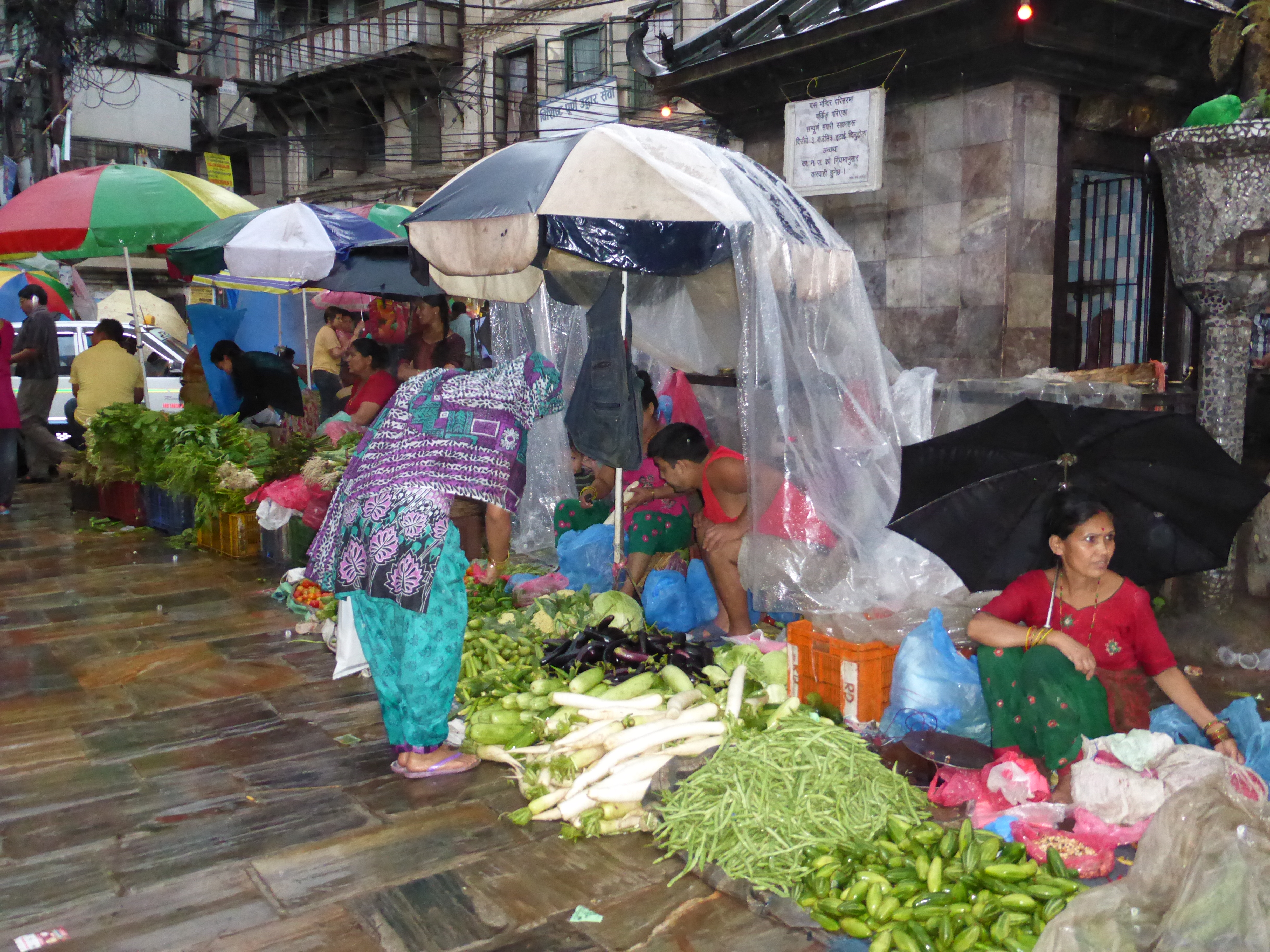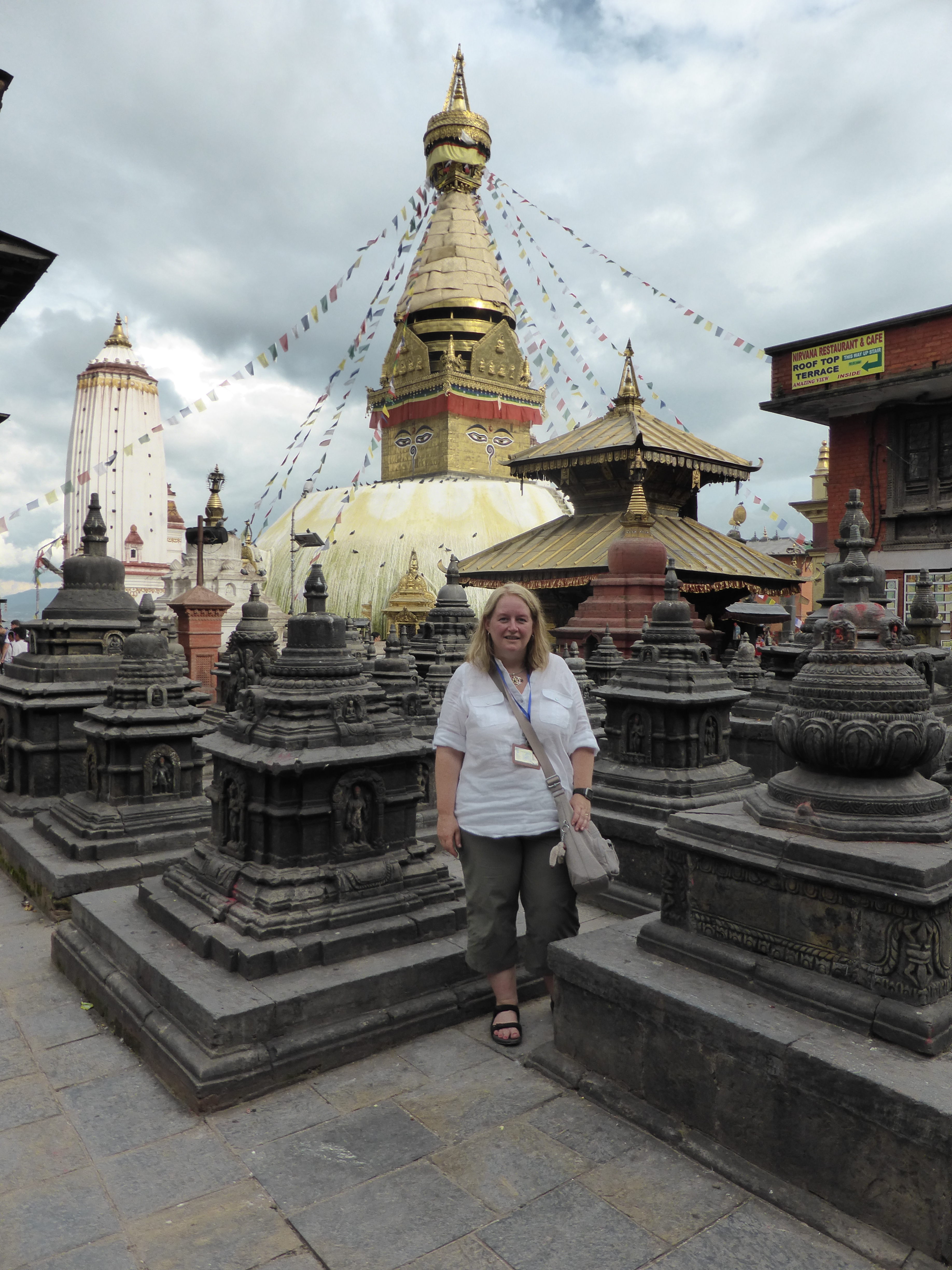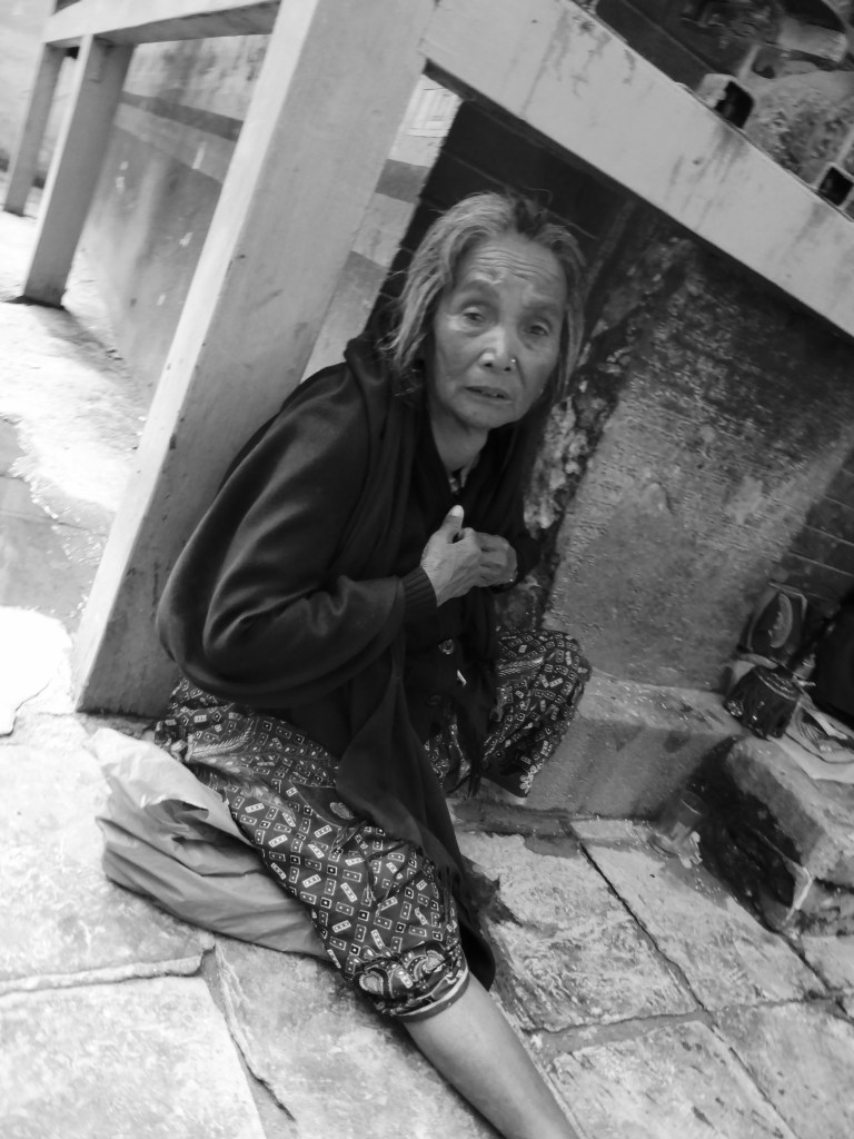 After leaving Kumari Square I blessed a statue that will take away all my fears and one of Ganesh that will give me wisdom (both needed!), then we had to take shelter under one of the open wooden temples as the Monsoon rain made its daily appearance. There were crowds of Nepali and I huddled there with not many of us being aware of personal space! We waited ages for it to stop but then had to brave it. Cue Miss Wet White Linen Shirt 2013! Imagine the look; no make up, sopping hair and up to my ankles in the sudden lakes that appear instead of puddles, all the while dodging pedestrians, cycles, rickshaws, buses, taxis and motorbikes. It’s not unusual to see an elderly lady in a beautiful sari sitting side saddle as a passenger weaving her way through.
