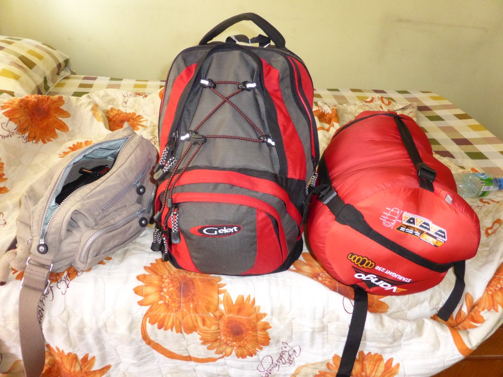 I hope I have perfected my “capsule” wardrobe. I am wearing long hiking trousers, a vest top and a hiking shirt with my hiking boots. In my rucksack I have 2 sari type skirts, 1 hiking 3/4 trousers, 2 other 3/4 trousers, 3 T shirts, 2 long sleeved white linen tops. I pair of socks, 1 bather, 3 scarves and my Tilley hat. 2 sandals. That’s it. Are you impressed? No Radley bags, just one Kipling bag. And knickers, as long as I remember to put them in. Oh and I’ve discovered linen creases. Like really badly creases. I will be washing my clothes by hand (imagine that? Like olden days!), so I have a secret weapon in that I’m taking 2 inflatable clothes hangers. Cool or what!
