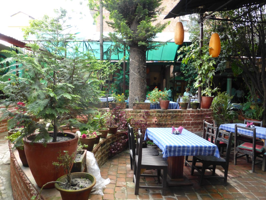 I went straight to my favourite internet cafe and spent an hour and 68p updating my blogs. I was boiling and needed a drink, so I went back to the shady courtyard of the Hotel Mandala to have a coke. I like it there. It’s right on the craziness of Thamel, but is so green it seems like another world, especially with the chill out music playing.