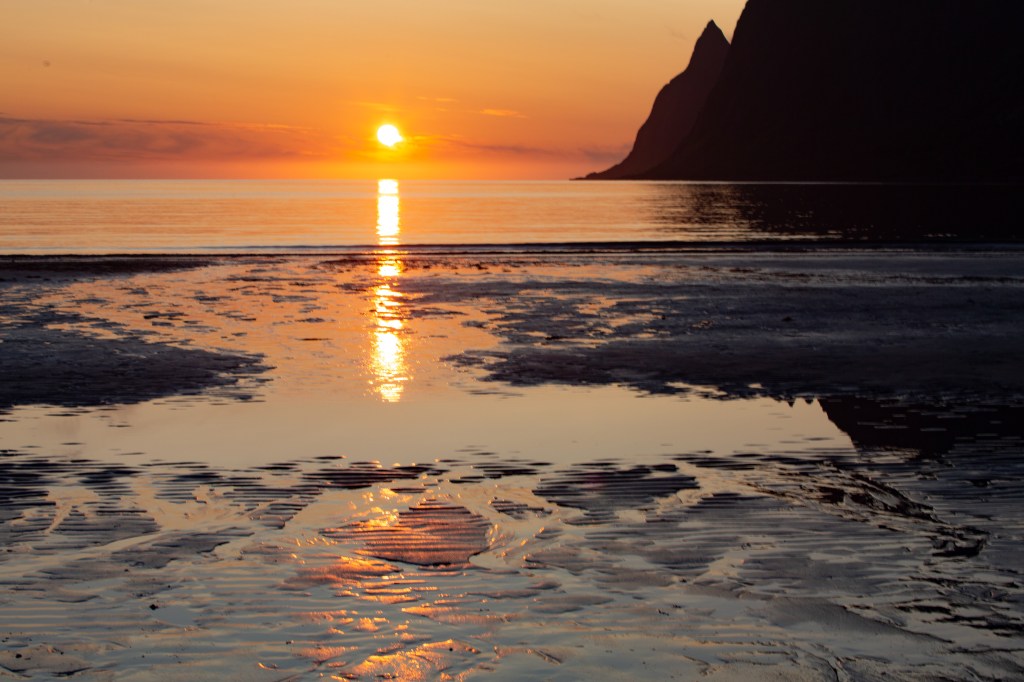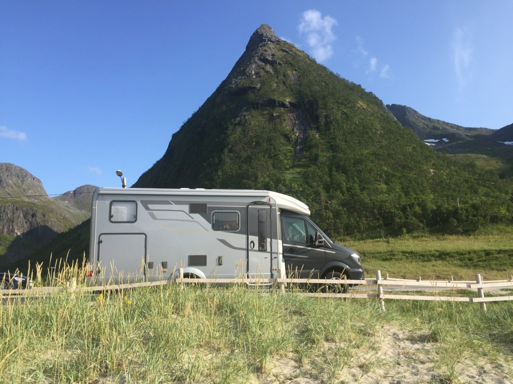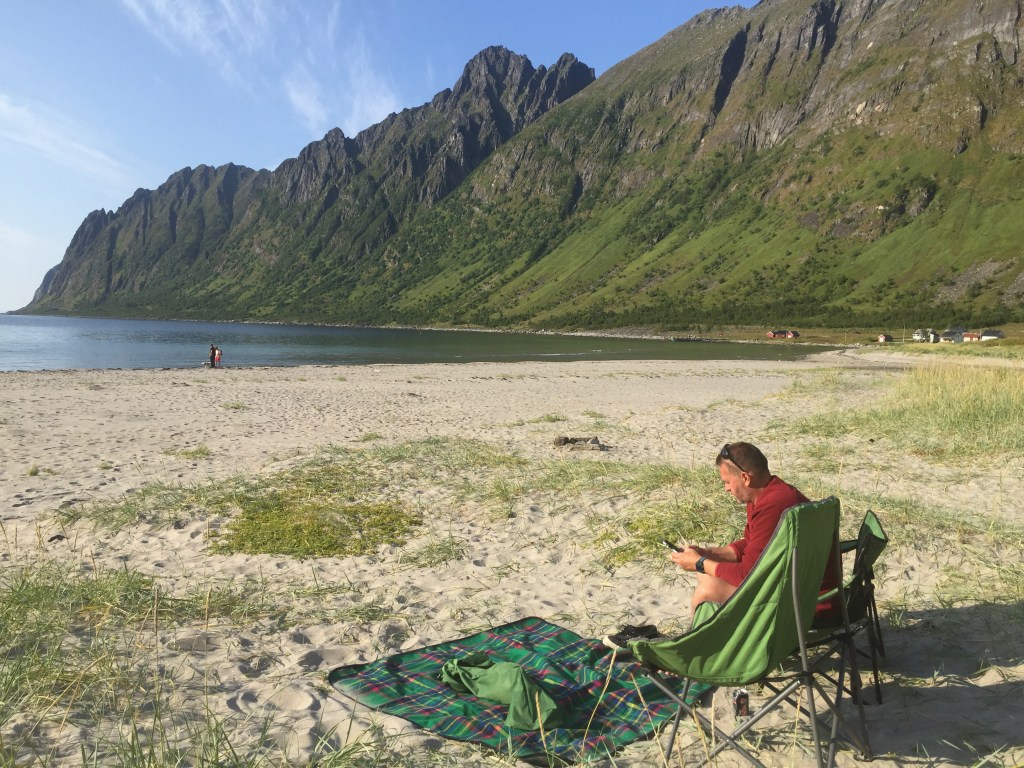 We eventually arrived at where I wanted to spend the night. Luckily my expectations lived up to reality, and I wasn’t disappointed. We stayed right on the beach at Ersfjord, and when I say right on the beach, I mean right on the beach! Lyn was in his element watching the Norwegian in front of us getting towed off his sandy spot in his motorhome! Luckily, Lyn had chosen our spot with care and we had no problems. He’s the man! I cooked a Malaysian chicken coconut curry and rice for dinner, and we settled in for the night with this awesome view.