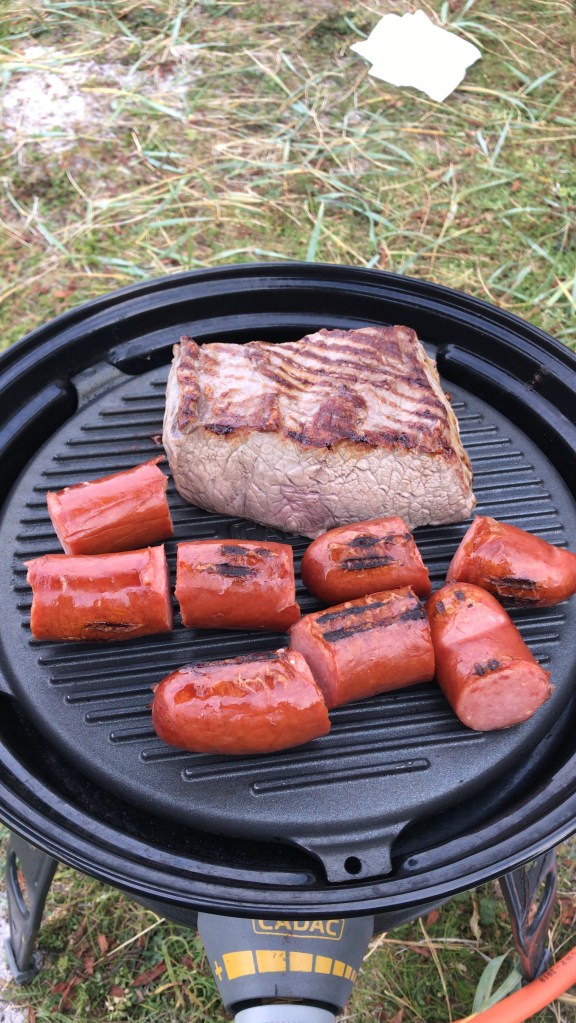 It was time for our first BBQ, so Lyn braved the cold, and sat outside barbecuing some steak.