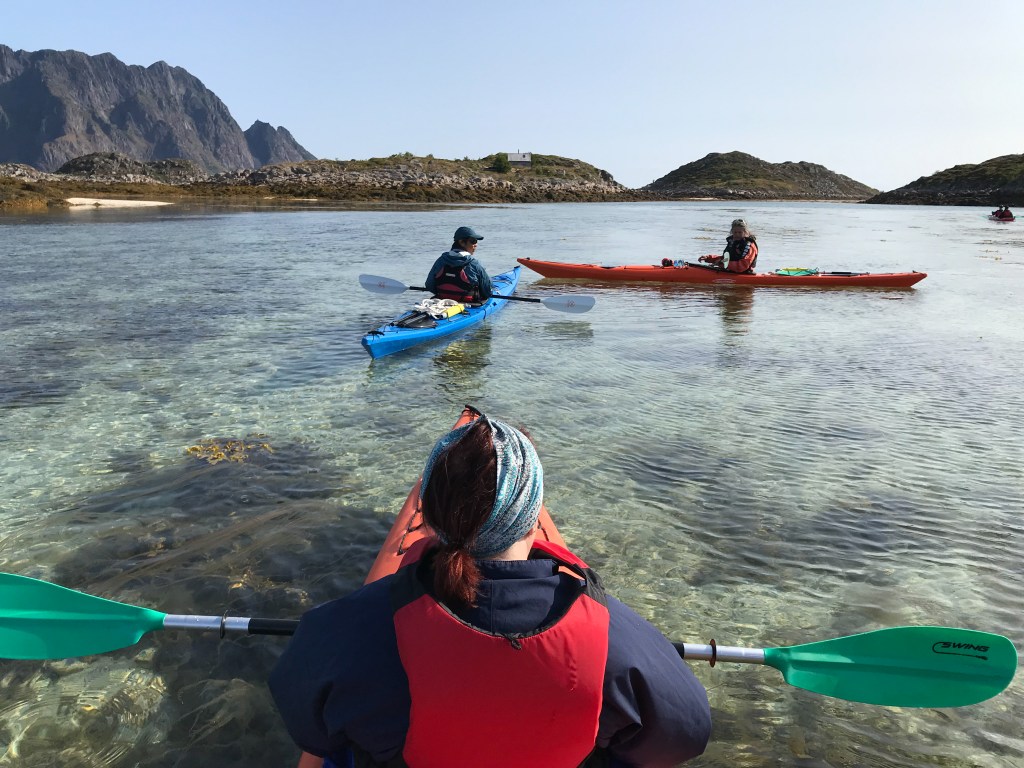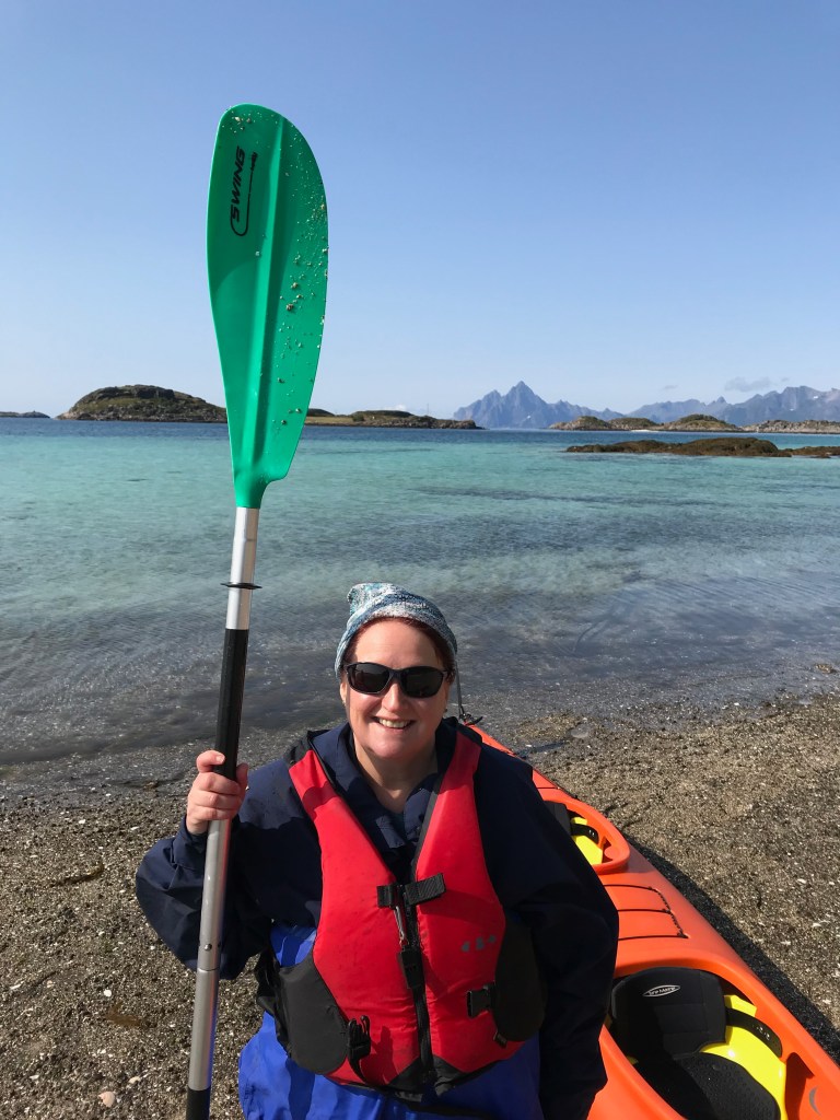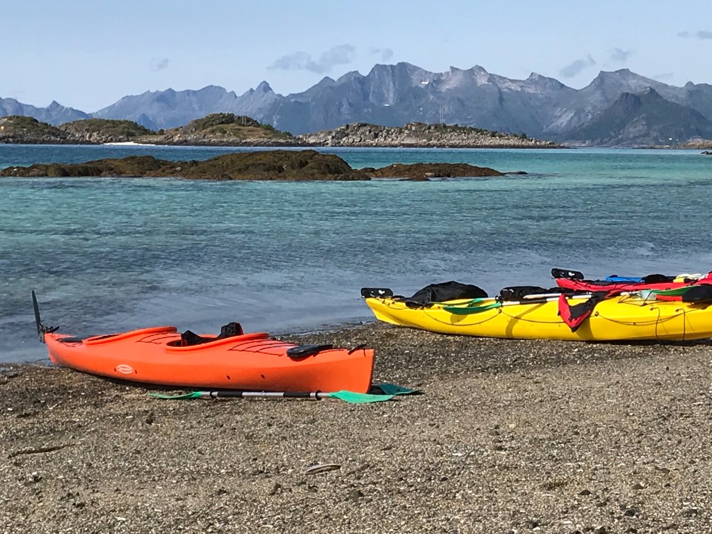 We got to Skrova, and were met by our two guides; an amazing Australian woman and an equally amazing Malaysian man. They talked us through everything we needed to know, and quickly worked out Lyn was the tallest person, so guess who was in the biggest kayak? Yup! We tried it out on land, but there were still problems getting Mr Long Legs in the bloody thing; to the extent that he couldn’t use his legs to use the rudder. So, in effect we were going to be rudderless! This was not going to be an easy kayaking trip as the rudder steers the bloody thing! It would all have to be steered by paddling.