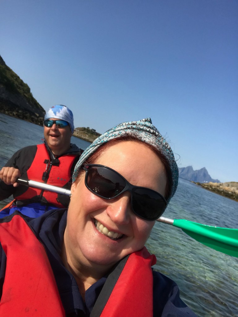 Early start for us this morning; it was going to be a big day! We were up at 7.30am and walked the 10 minutes or so into the centre of Svolvaer ready to meet our kayaking trip. Already the little gremlins of doubt were playing in my mind…..was I dressed warmly enough? Would I be too cold? Would I be able to get into the kayak easily? Would I be able to get out?? Yes, we had done kayaking in Stockholm, but this was to be a very different type of trip, as it was a guided one, along with another 10 people. It’s ok looking stupid when it’s just me and Lyn (he’s used to it!) but this would be very public! Never mind, out of my comfort zone again, and nowhere to hide.