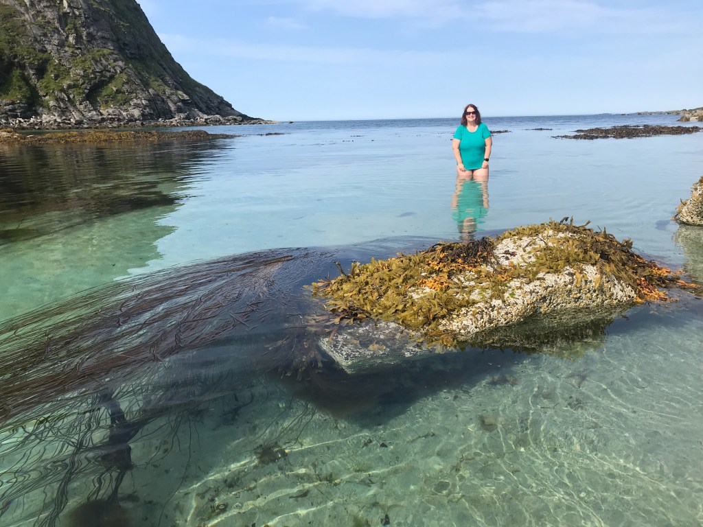 We hoped to get a few miles under our belts today, so off we drove, past the usual beautiful scenery. Our next ferry was an hour long one, from Jetvik to Kilboghamn, so we headed up onto the deck. This was going to be the ferry journey where we crossed out of the Arctic Circle. We tracked this on Pocket earth, looking for the 66.33 latitude, but an announcement was made on board, so people could go out and look at the globe on a nearby island that marked it. We both felt a bit sad; would we ever return? We have flown in and out of the Arctic Circle, driven into it and sailed out.