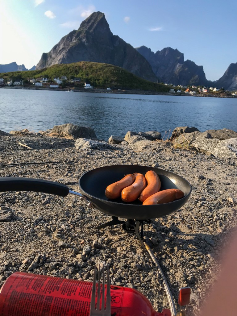 We then drove on to where we hoped to stay tonight; the famous fishing village of Reines on the island of Moskenesoya, which has been dubbed one of the world’s most beautiful villages. It has red and white fishermen’s huts dotting the shoreline, and huge granite mountains shooting out of the Reinefjorden. It is beautiful, and peaceful, and we have an idyllic free spot overlooking the water. We sat outside enjoying the sunshine and the view and Lyn cooked some of his beloved sausages (yuck!), before watching the sunset and opening the gin for a VERY small one!