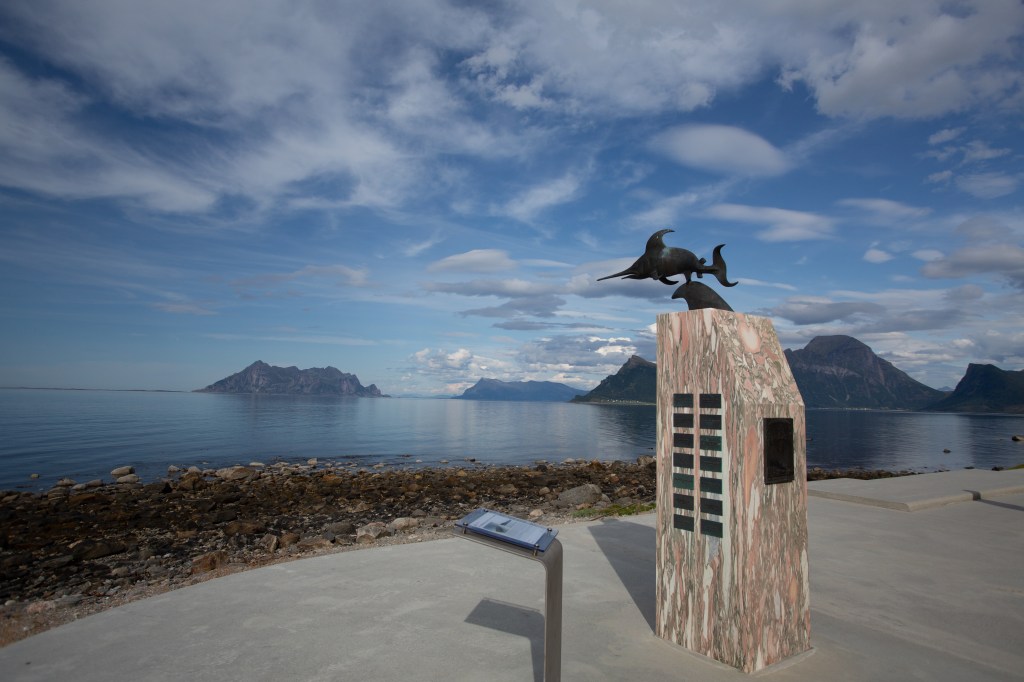 We then drove and drove down route 17. So much beautiful scenery; fjords, tunnels, mountains, sea…it was endless, but in a good way. We stopped off at a beautiful rest area, where there was a monument for the Norwegian submarine Uredd (fearless) which sank after hitting a German mine in 1943 during Operation Seagull. The waters were supposed to be safe according to British intelligence, but this was not the case, and for 42 years it lay at the bottom of the fjord with a big hole in the hull at 105m deep. It is now a war grave, and a beautiful monument of a swordfish points out in the direction of it. This rest stop is fabulous, and has, apparently, the most beautiful public toilet in the world!