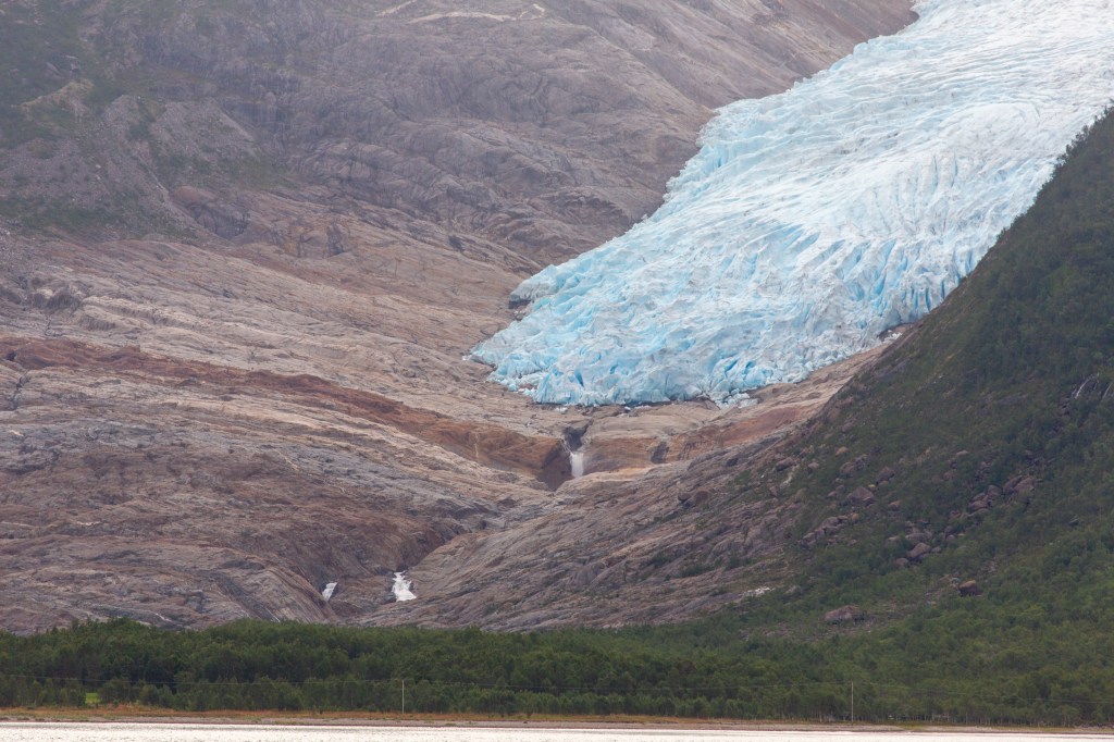 We were heading towards the Svartisen glacier where we wanted to stay the night. Before we could get there we had to navigate the very scary tunnel. Norway is full of tunnels; why go round a mountain when you can go through them? This tunnel is 7624m long, and was opened in 1986. It was the longest tunnel in Norway when it was opened, but is now the fourth longest. The boring machine was 6.25m wide, so the lanes are too narrow to have a centre line, which makes it difficult to pass oncoming traffic on the 7km straight. Oh and it’s dark, very dark! We were glad to get out of there, especially when we realised we were under a glacier with 200m thick ice above our heads!
