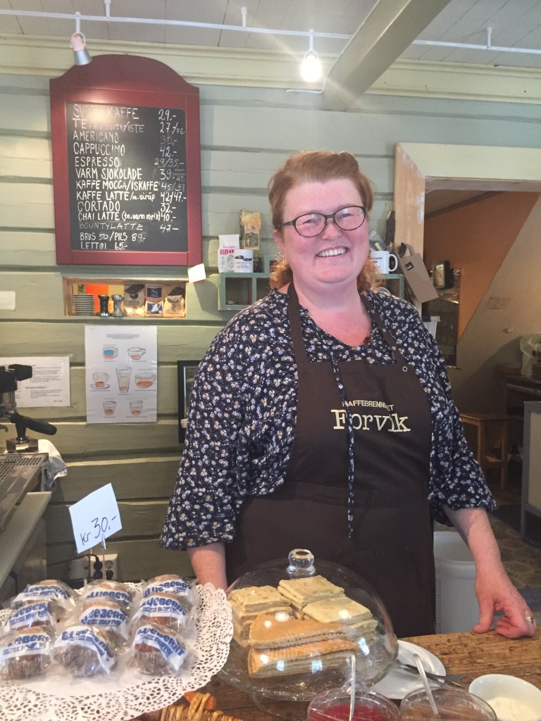 Our big highlight today was stopping at the northernmost coffee roasters! We had a huge welcome there off Hanna the owner, and both enjoyed a cup of coffee, and bought a bag to bring home. A mere 22 pounds! Yikes! It was interesting to hear the story of her background as the café has been in her family for 4 generations, since 1881, it has been part of a trading post there, as in the old days sailboats were the only effective way of transport, and fjords the only highways, so it made sense to put the trading post in a cape in a fjord protected by the mountains, with the possibility of a harbour and pier. The area had played a key role in the resistance work in WW2, and served as a hiding place for secret servicemen smuggling refugees to England, and getting weapons and equipment from England.