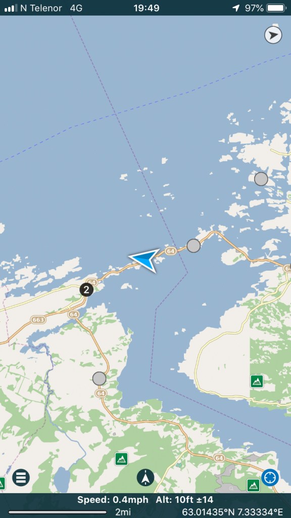 The weather clouds chased us all day, so we decided to bypass Trondheim and head down to the ocean road. Trusting Tom Tom to guide us, we now must be seasoned travellers as the route took us to a ferry, which we now naturally joined and sailed across in style.