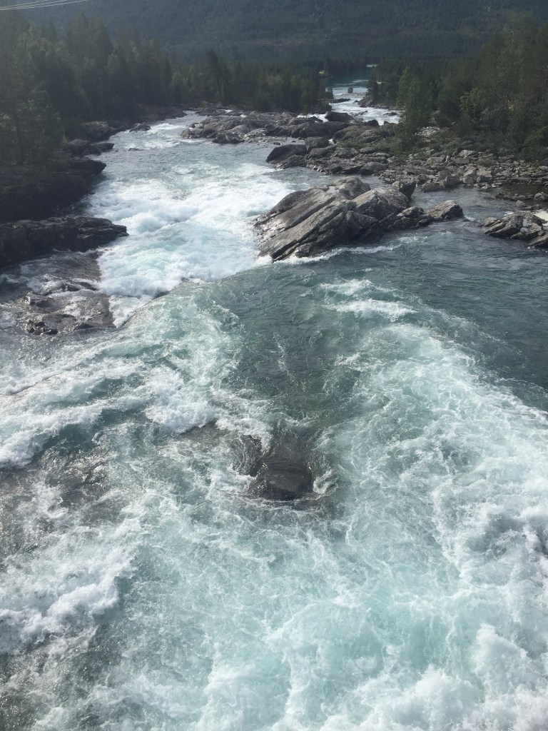 Our first stop was at Saltstraumen. This is a small strait about 10km south of Bodo with the world’s fastest tide. If you time it right and consult the tide time tables you can catch one of the 4 tides a day and see the famous maelstrom. We timed it so we could visit at high tide, when 400 million cubic metres of water rush through the 150m wide and 3km long sound, at speeds of up to 20 knots. This causes whirlpools up to 10m in diameter and 4-5m deep. We walked to the top of the bridge to watch it, and looked down on the swirling waters and the jet skiers and RIB trips that had come out to play on it. It was quite impressive.